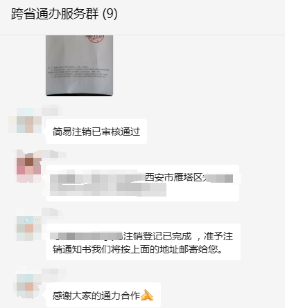 了解情况后,芦淞区市场监督管理局立即启动“跨省通办+帮办代办”服务,安排跨省通办窗口的专人负责对接此事,与西安的工作人员取得联系,并建立了有效的沟通机制,第一时间向对方发送了湖南省企业简易注销指南,详细解释注销流程、所需材料以及注意事项。等待公司的简易注销公告期满后,6月11日,工作人员立即开始线上“一对一”指导简易注销登记,全程网上操作,相关文书通过邮寄的方式送达保存。