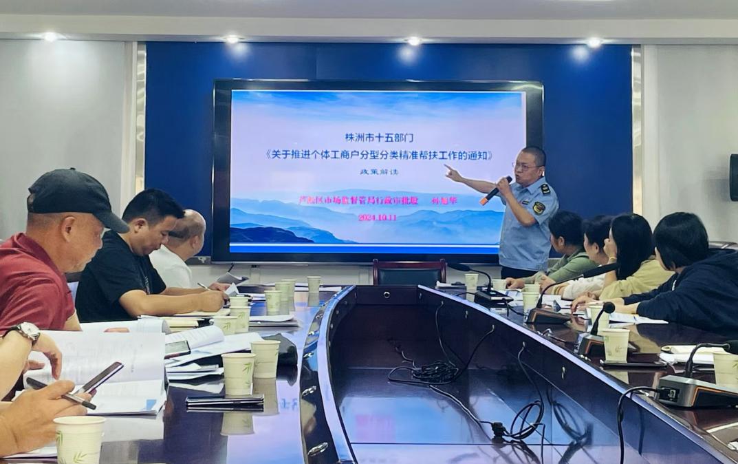 会上,区市场监管局行政审批股工作人员对"株洲市十五部门印发的《关于推进个体工商户分型分类精准帮扶工作的通知》"的政策进行了全面解读,对分型分类概念、标准、方式等进行了详细讲解,播放了个体工商户自主申报操作视频,发放《分型分类》宣传册、自主申报操作手册共50余册,使与会者充分了解分类分型的目的意义、申报流程。