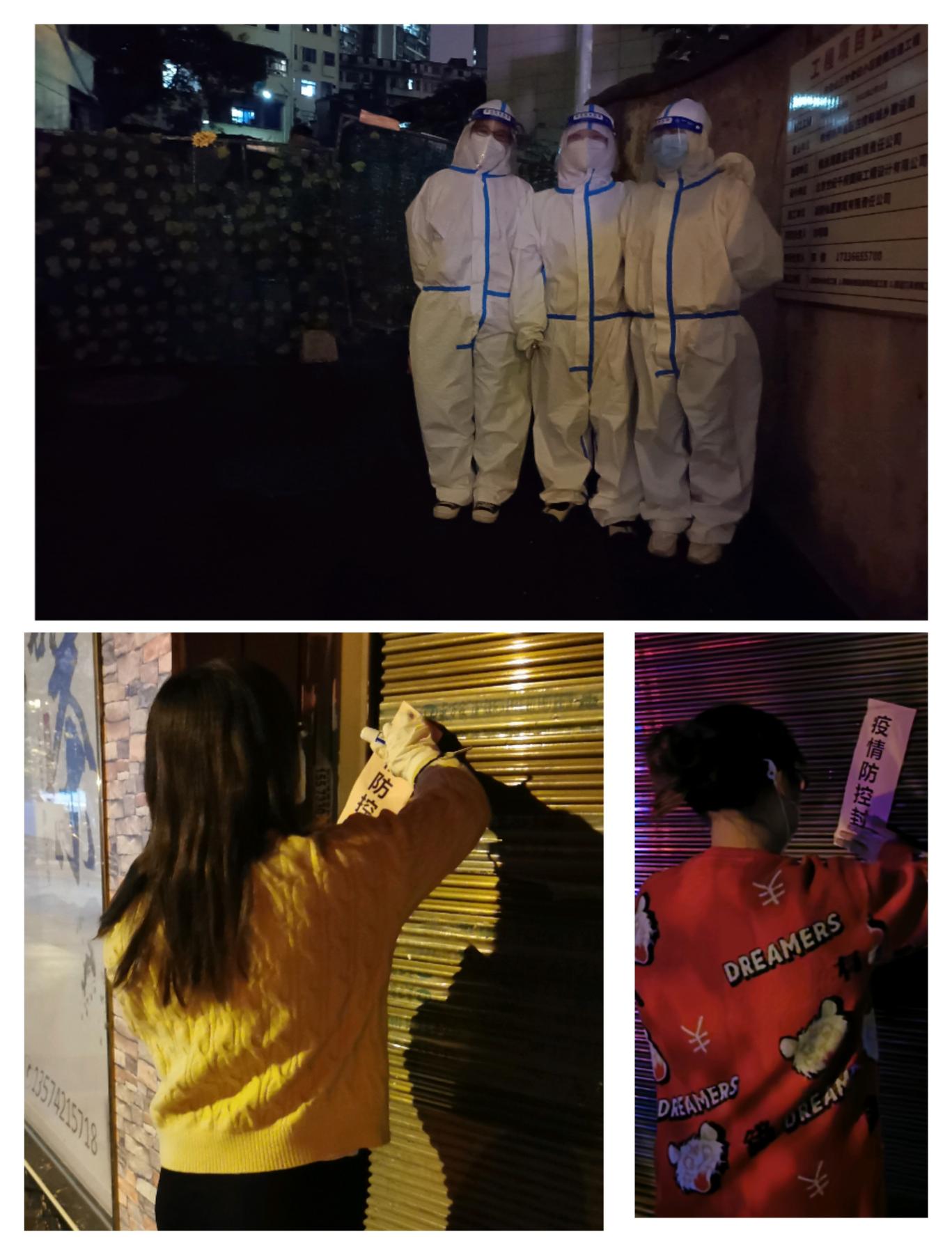 11月4日晚上12点,刚刚准备结束一天值守的黄琼、陈娟、周雅倩接到紧急通知,需要继续协助社区张贴疫情防控封条,她们二话不说,立即赶到社区协助工作人员制作封条,接着三人分头行动,挨家挨户张贴封条,一直忙碌到凌晨四点。她们18个小时的坚持就为争分夺秒与病毒赛跑,希望尽早消除疫情风险隐患,用责任和担当筑牢安全防线。