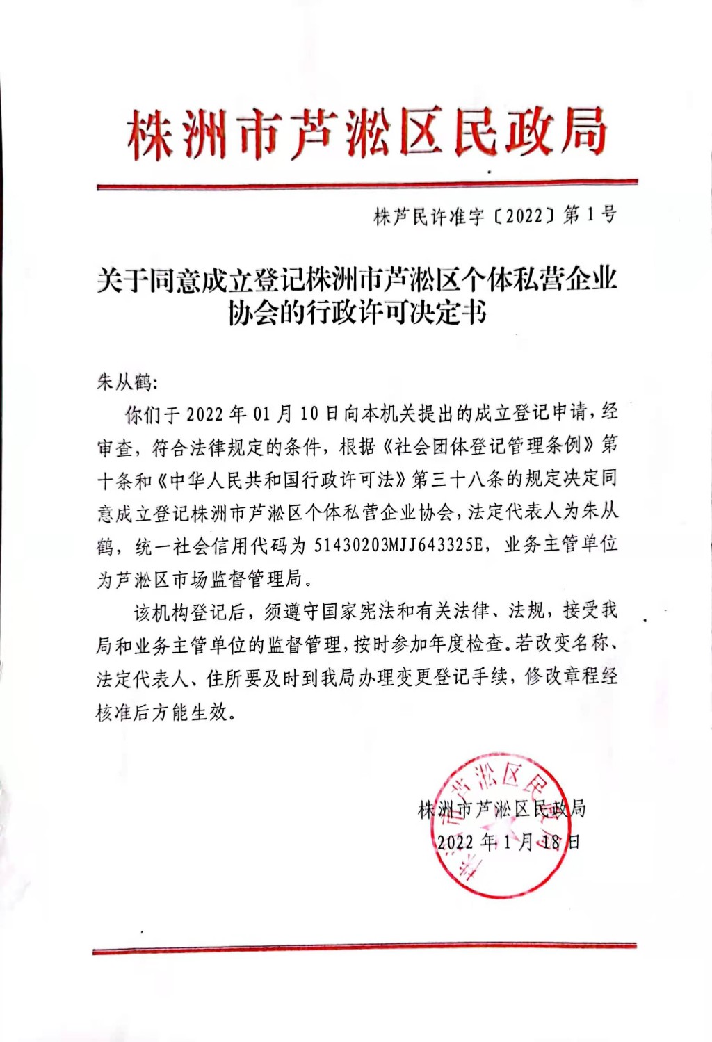 关于同意成立登记株洲市芦淞区个体私营企业协会的行政许可决定书