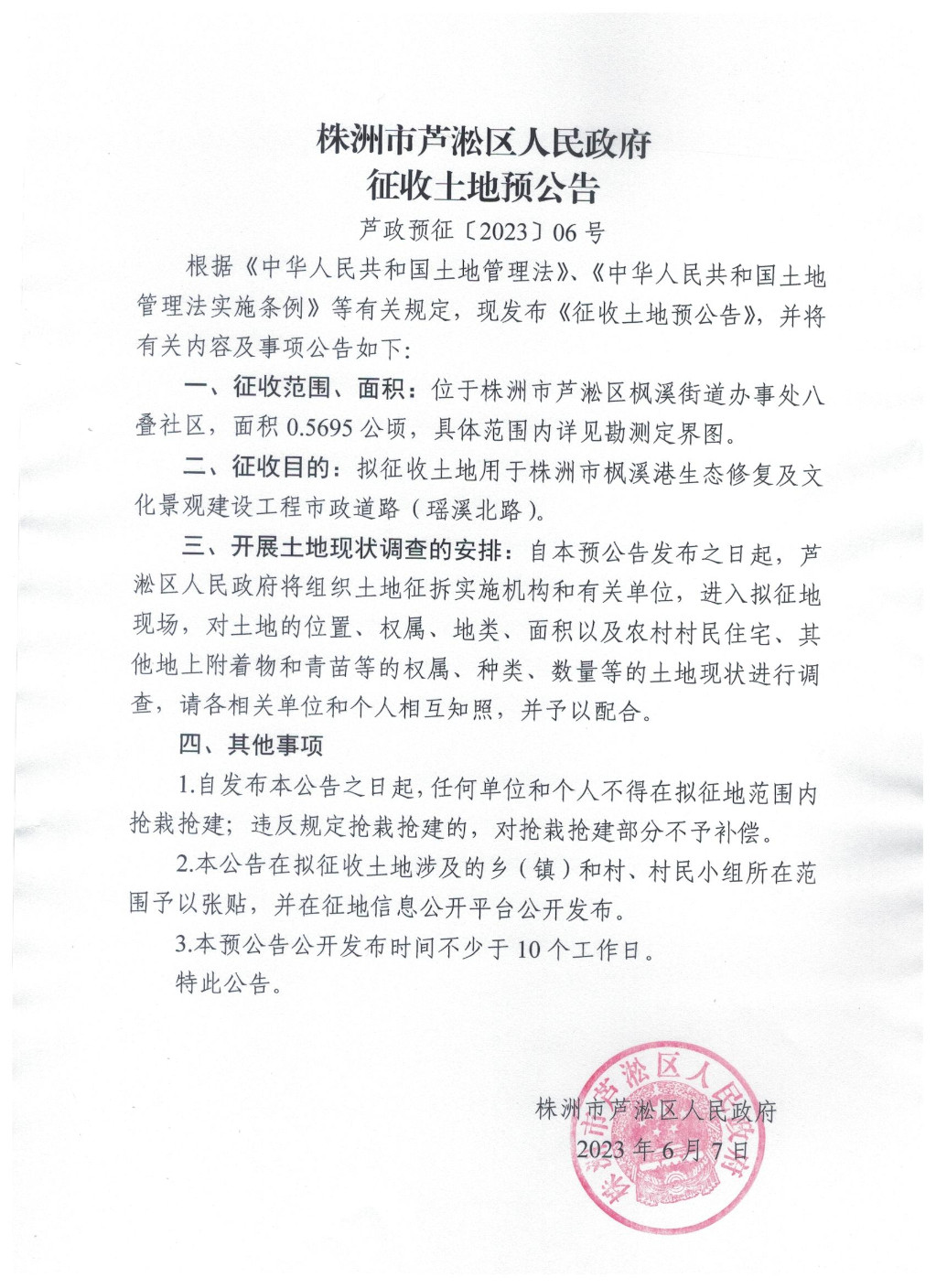 株洲市芦淞区人民政府征收土地预公告(芦政预征〔2023〕06号)
