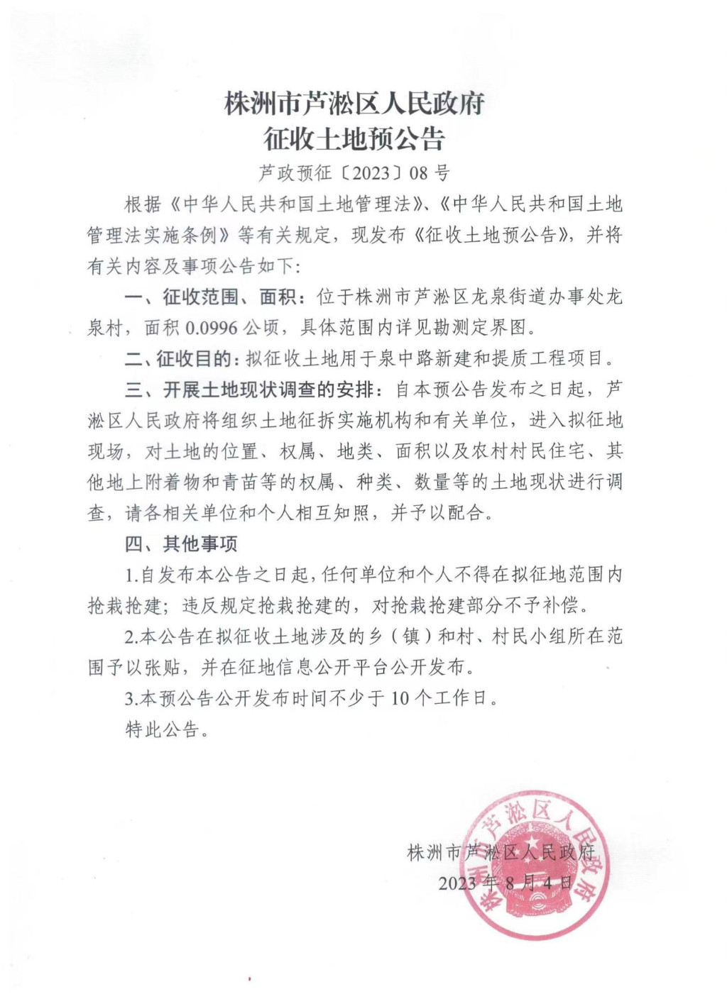 株洲市芦淞区人民政府征收土地预公告(芦政预征〔2023〕08号)