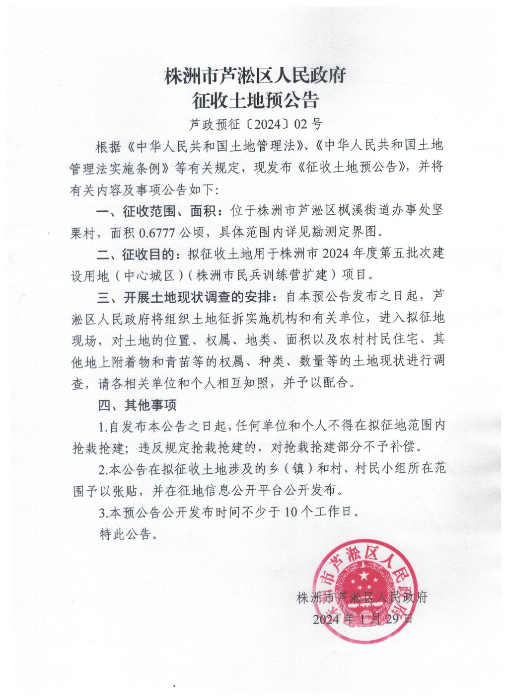 株洲市芦淞区人民政府征收土地预公告(芦政预征〔2024〕2号)