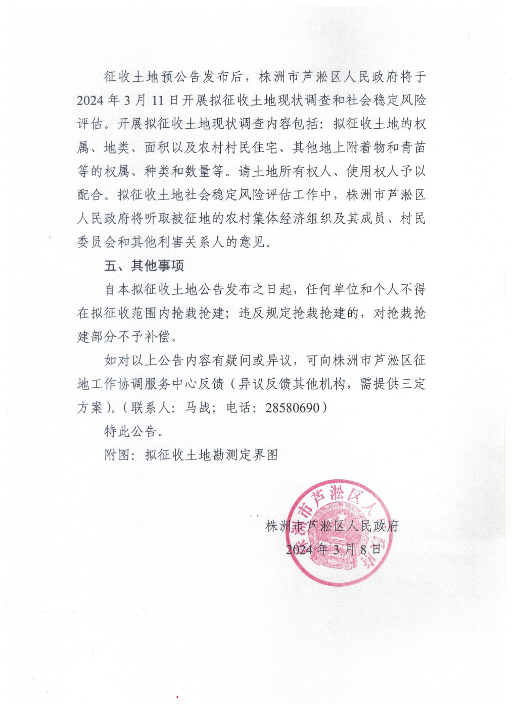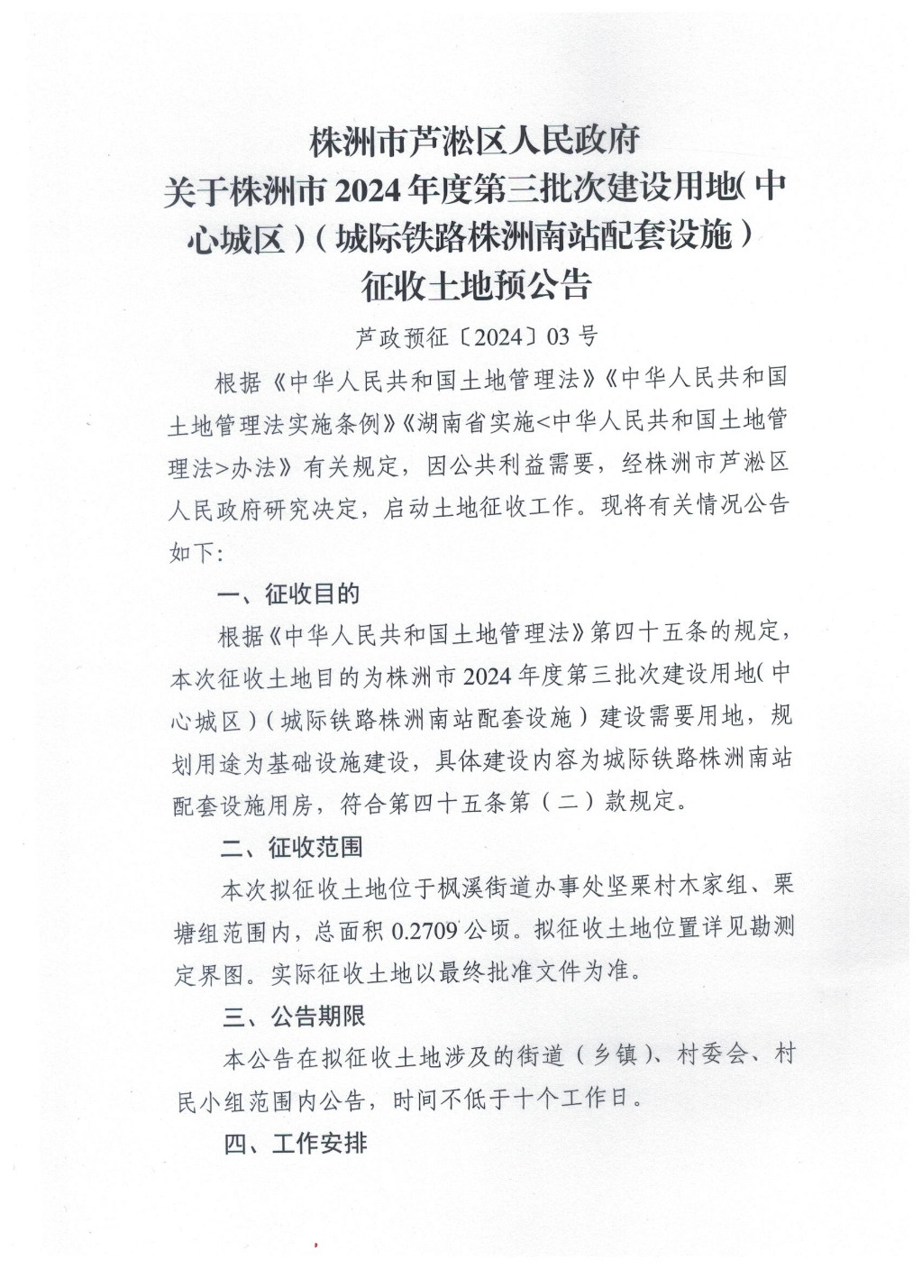 株洲市芦淞区人民政府关于株洲市2024年度第三批次建设用地(中心城区)(城际铁路株洲南站配套设施)征收土地预公告(芦政预征〔2024〕03号)