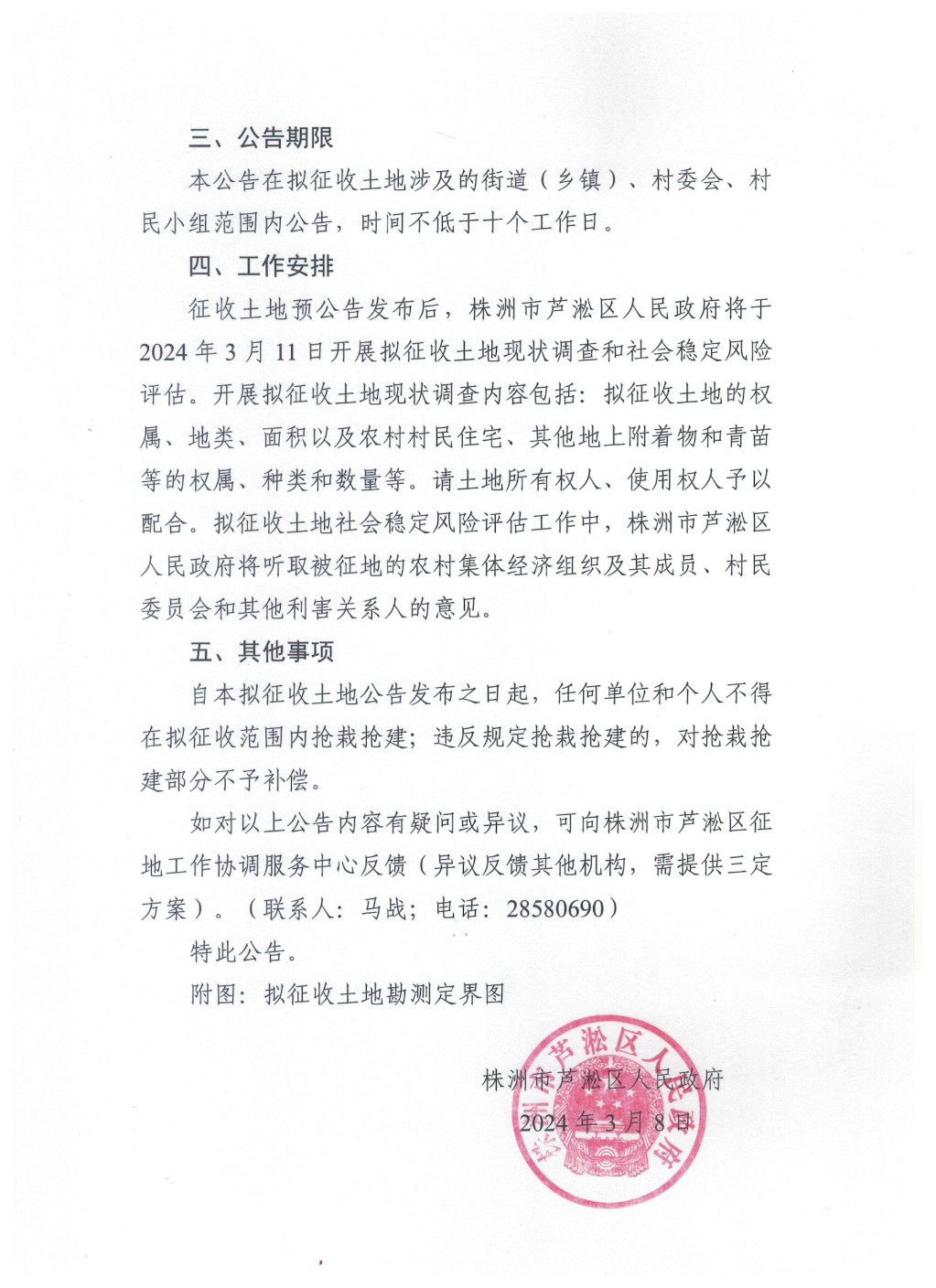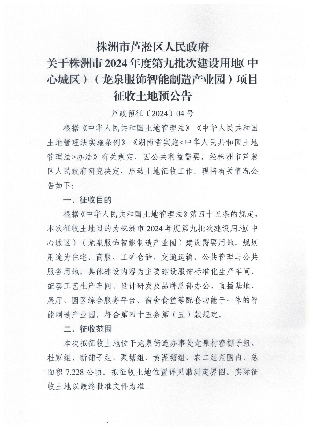 株洲市芦淞区人民政府关于株洲市2024年度第九批次建设用地(中心城区)(龙泉服饰智能制造产业园)项目征收土地预公告(芦政预征〔2024〕04号)