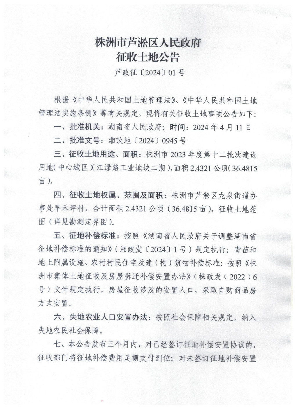 株洲市芦淞区人民政府征收土地公告(芦政征〔2024〕01号)