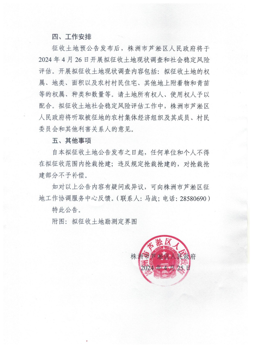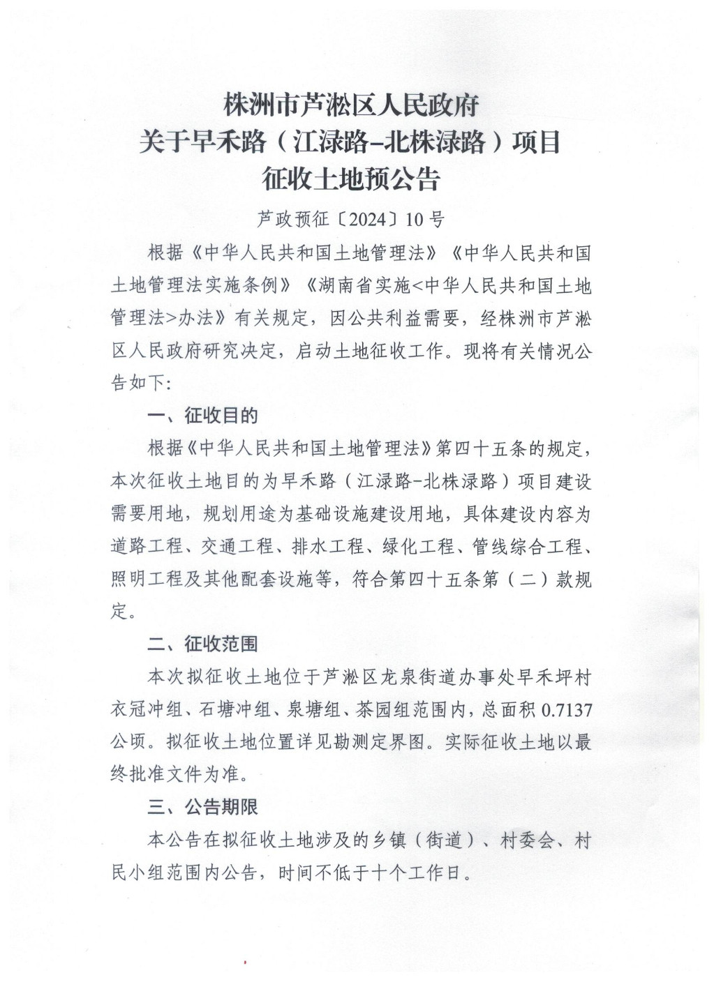 株洲市芦淞区人民政府关于早禾路(江渌路-北株渌路)项目征收土地预公告(芦政预征〔2024〕10号)