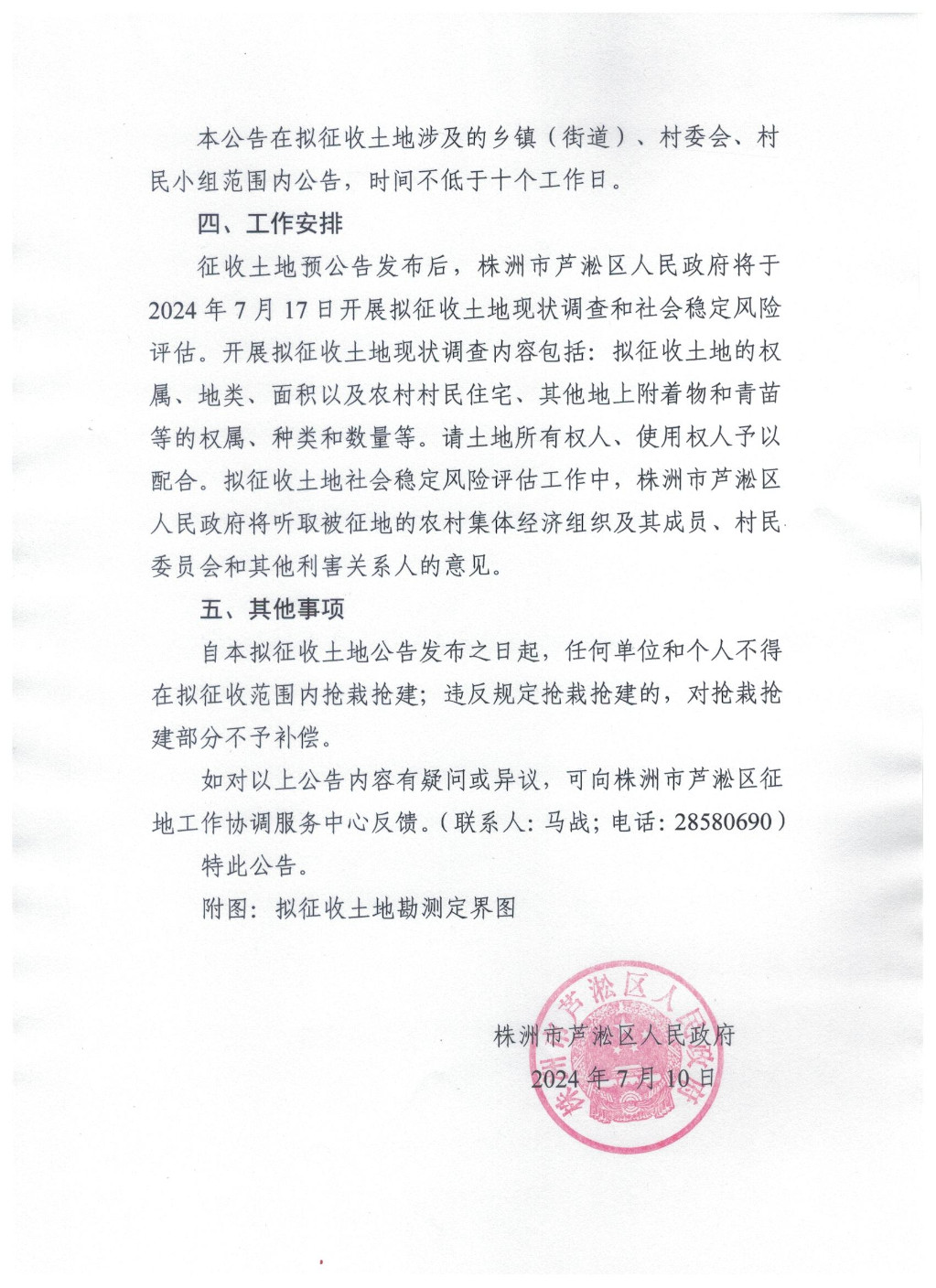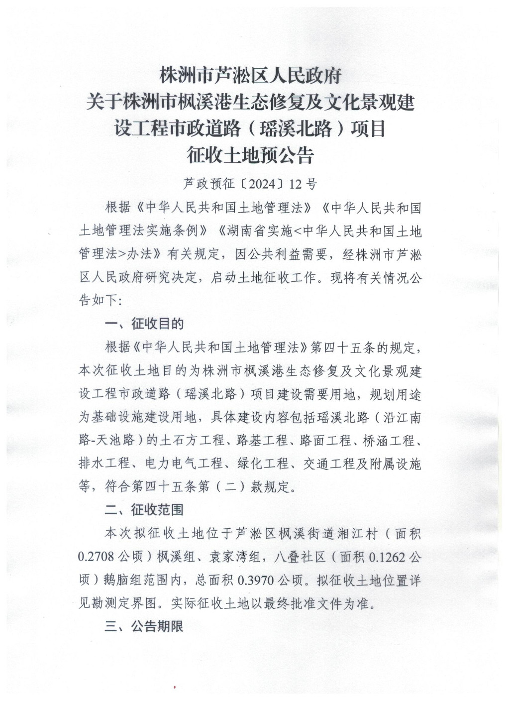 株洲市芦淞区人民政府关于株洲市枫溪港生态修复及文化景观建设工程市政道路(瑶溪北路)项目征收土地预公告(芦政预征〔2024〕12号)