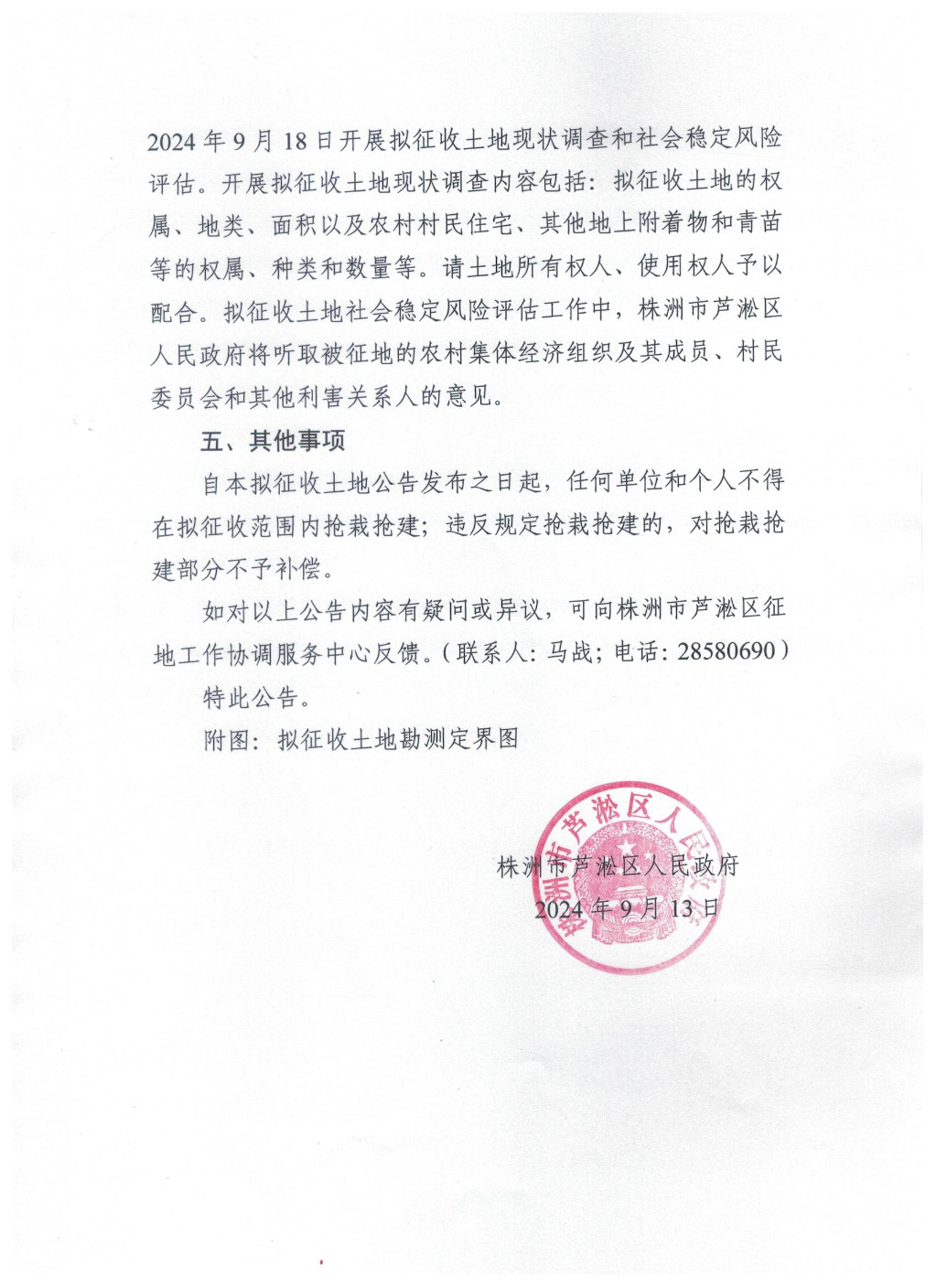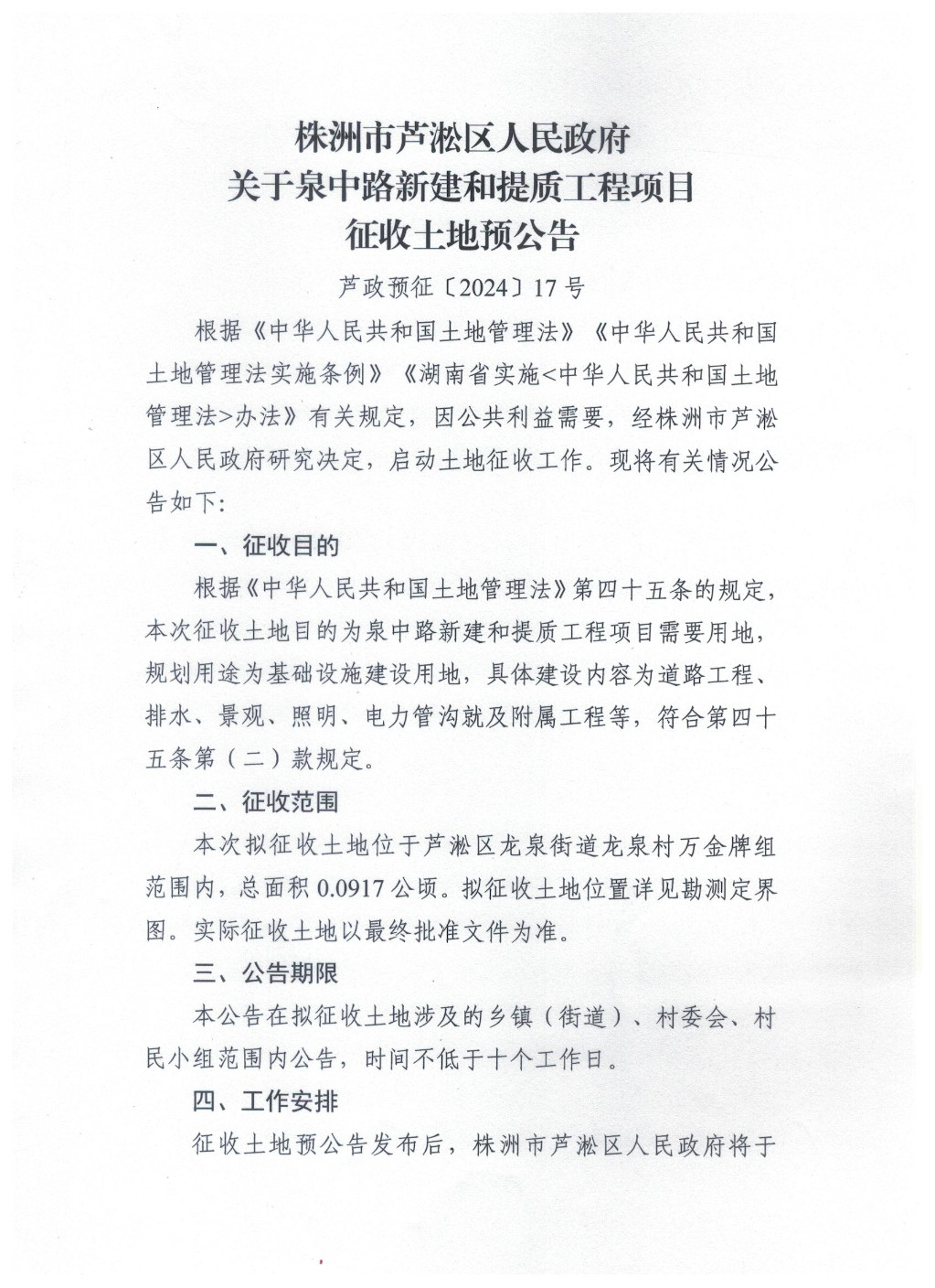 株洲市芦淞区人民政府关于泉中路新建和提质工程项目征收土地预公告(芦政预征〔2024〕17号)