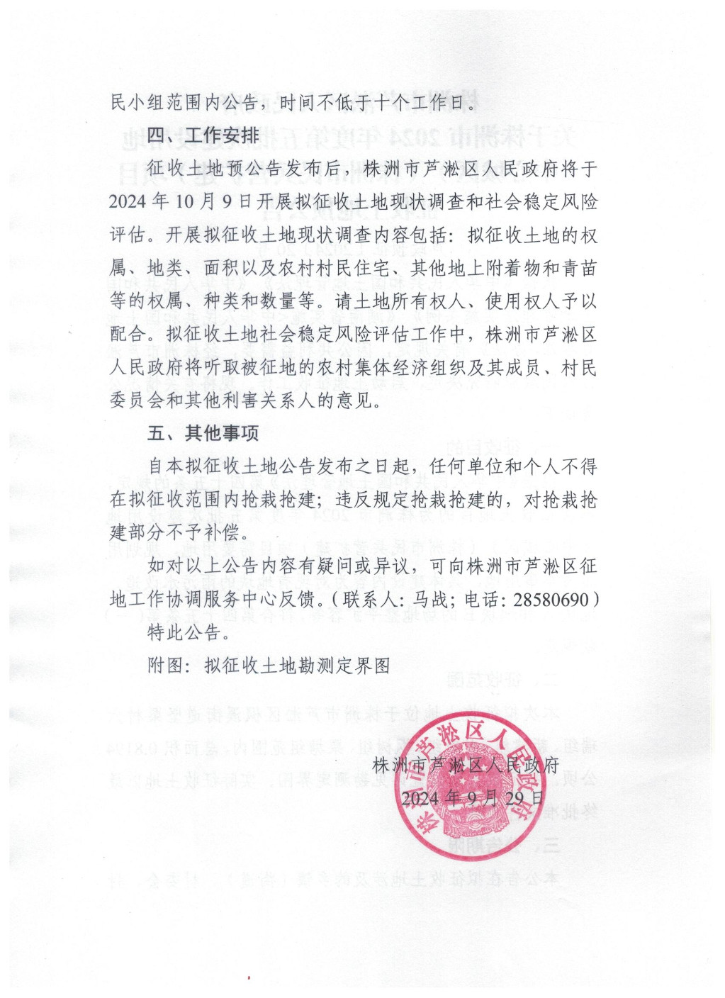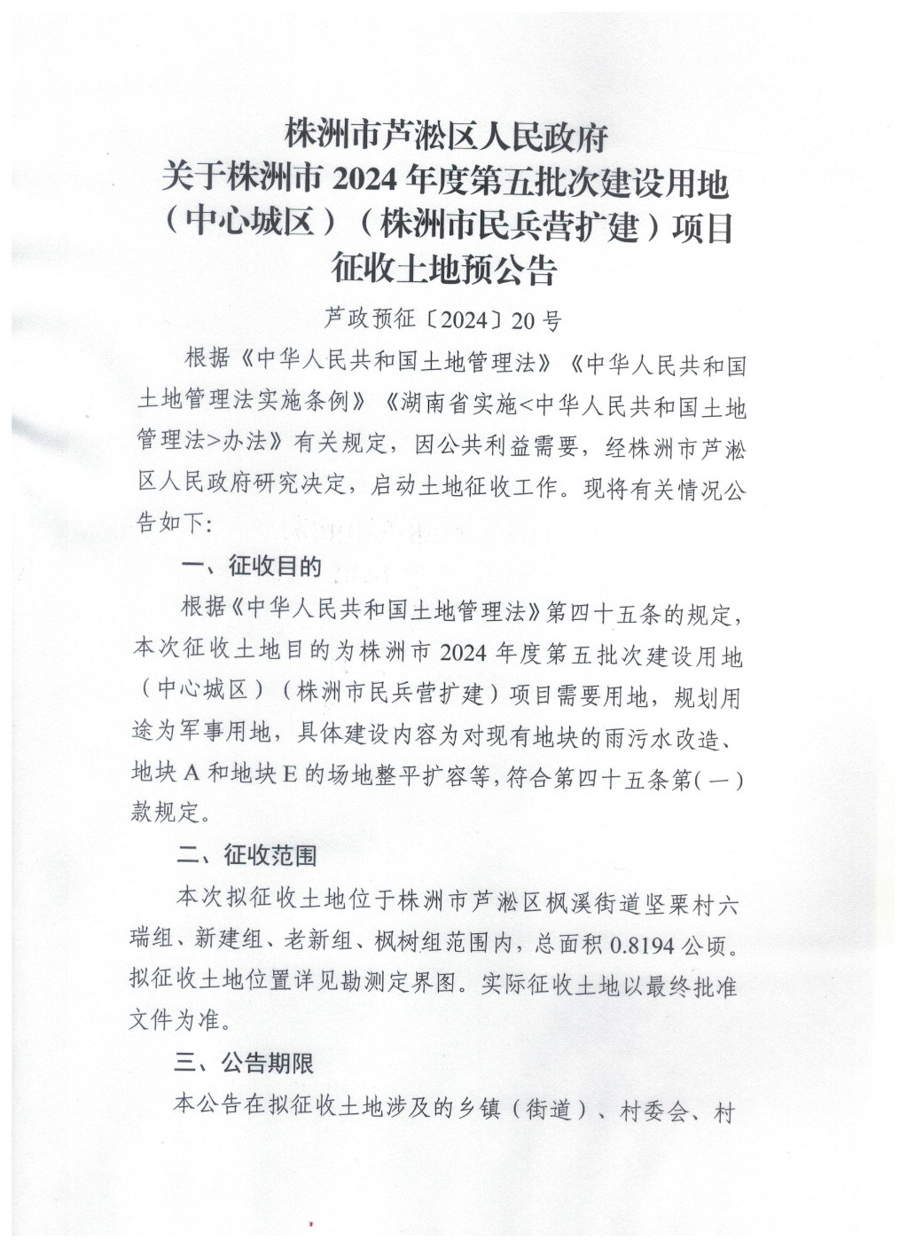 株洲市芦淞区人民政府关于株洲市2024年度第五批次建设用地 (中心城区)(株洲市民兵营扩建)项目 征收土地预公告(芦政预征〔2024〕20号)