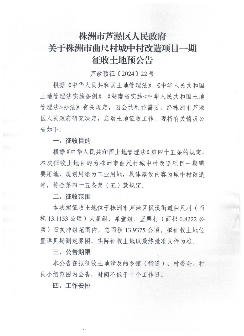 株洲市芦淞区人民政府关于株洲市曲尺村城中村改造项目一期征收土地预公告