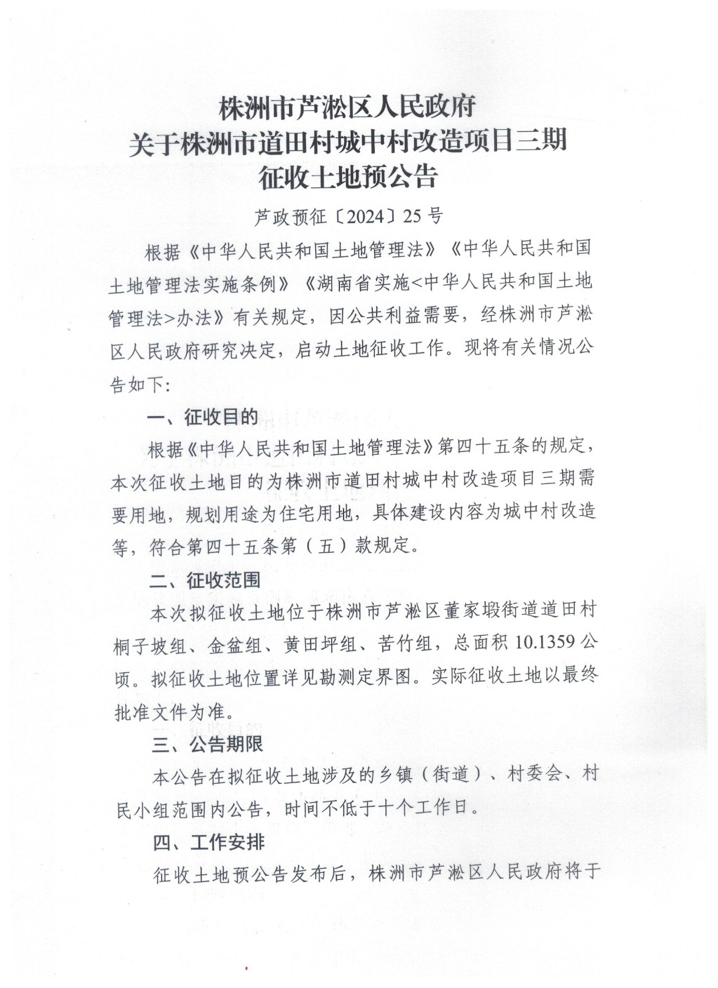 株洲市芦淞区人民政府关于株洲市道田村城中村改造项目三期征收土地预公告