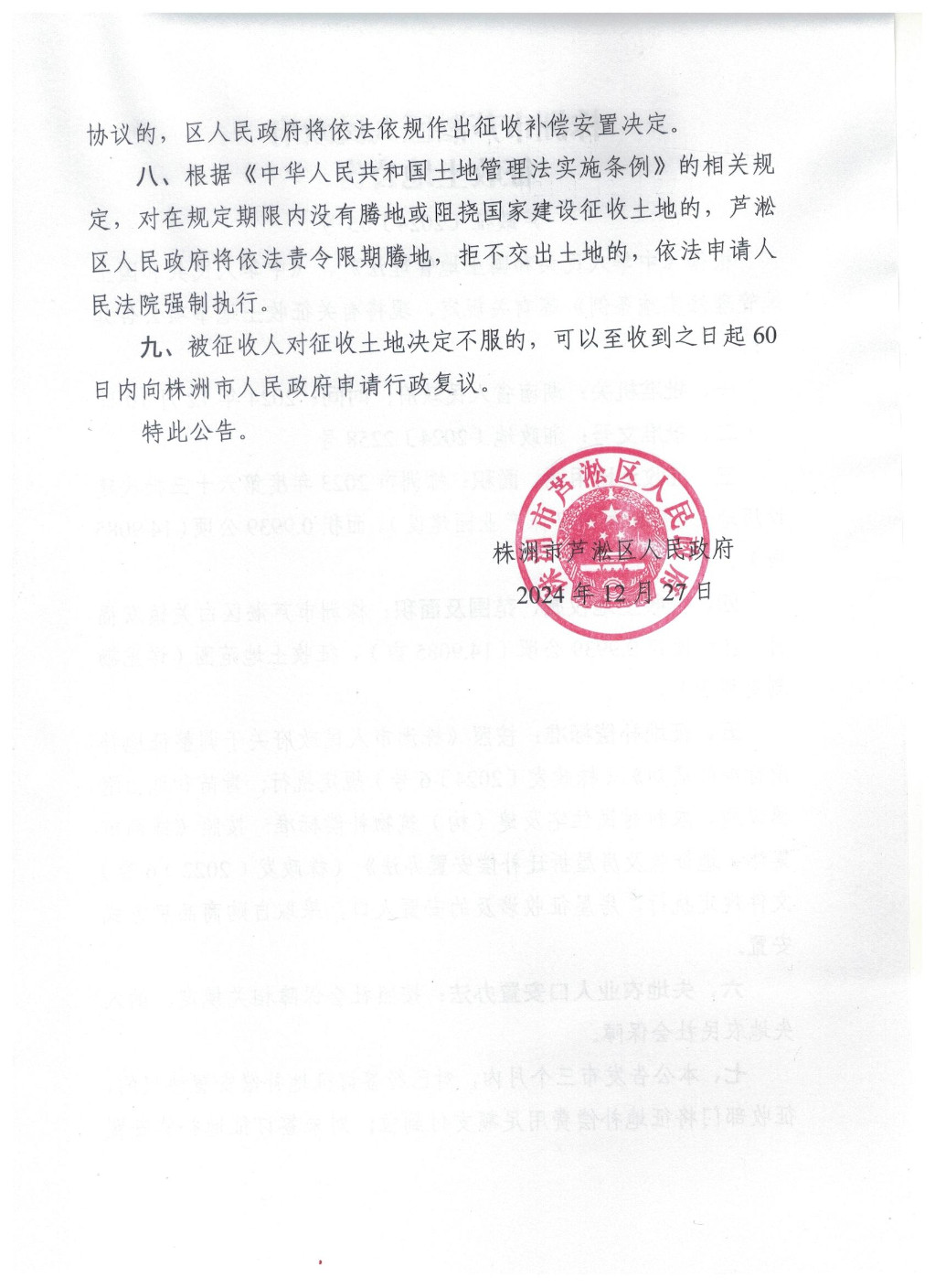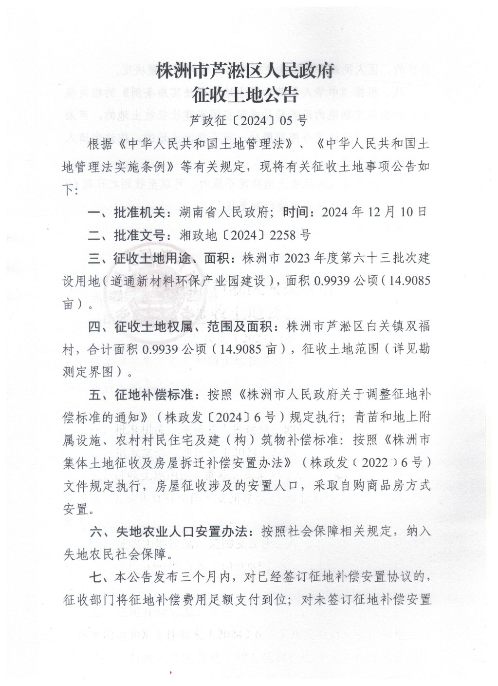 株洲市芦淞区人民政府征收土地公告(芦政征〔2024〕05号)