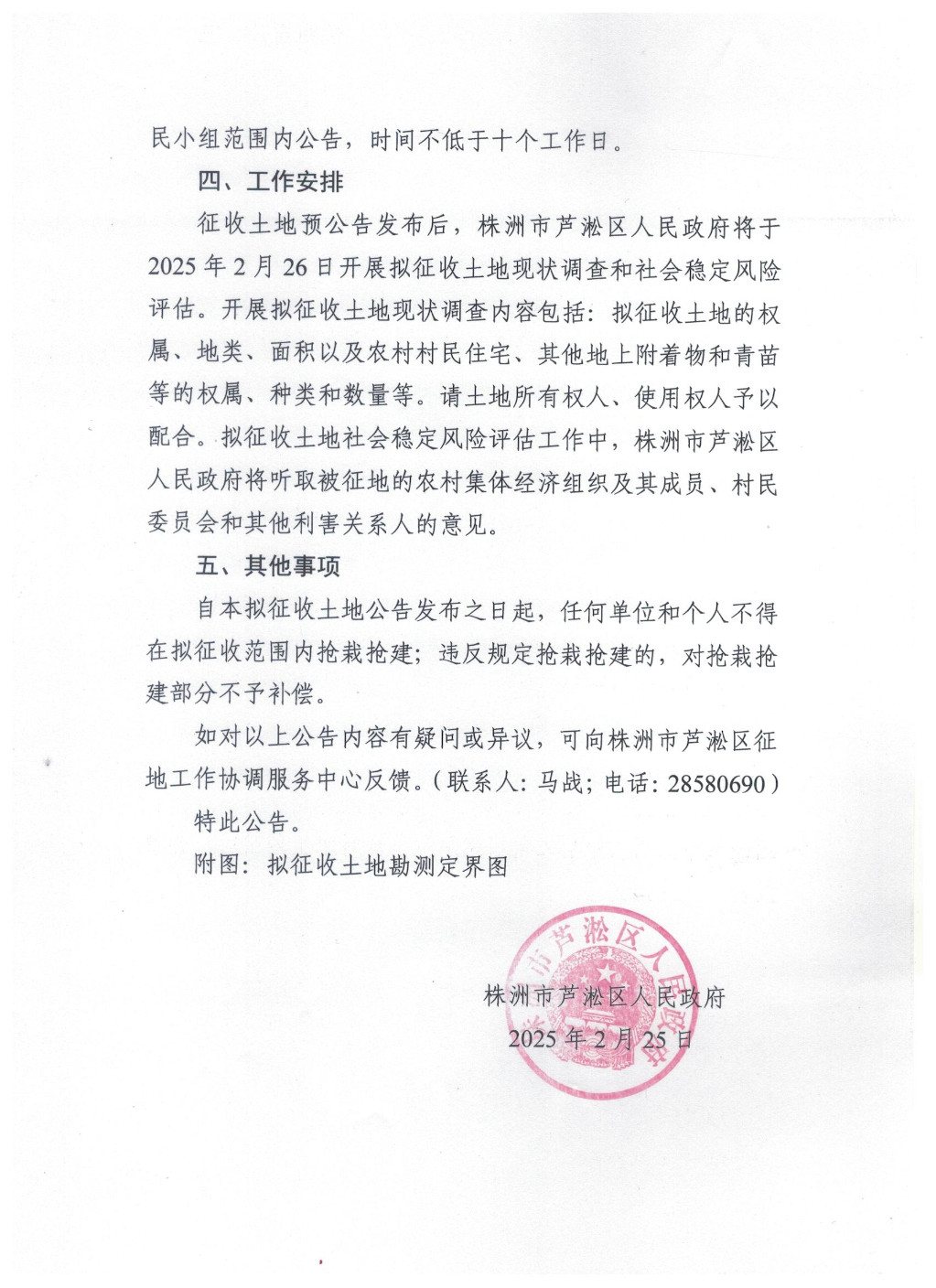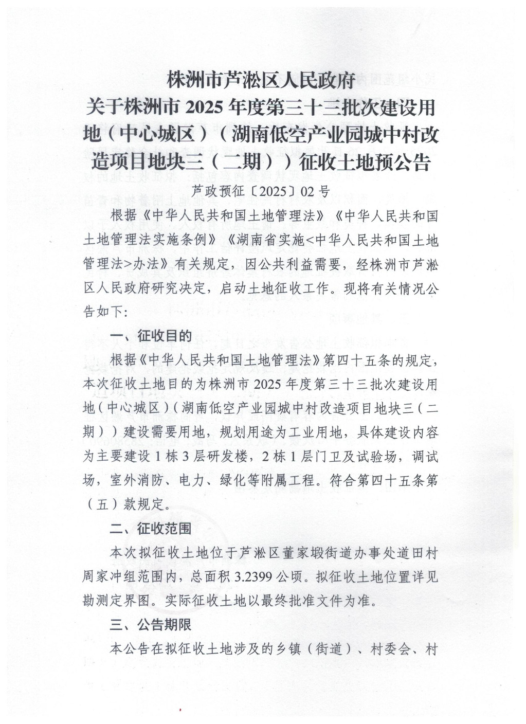 株洲市芦淞区人民政府关于株洲市2025年度第三十三批次建设用地(中心城区)(湖南低空产业园城中村改造项目地块三(二期))征收土地预公告(芦政预征〔2025〕02号)