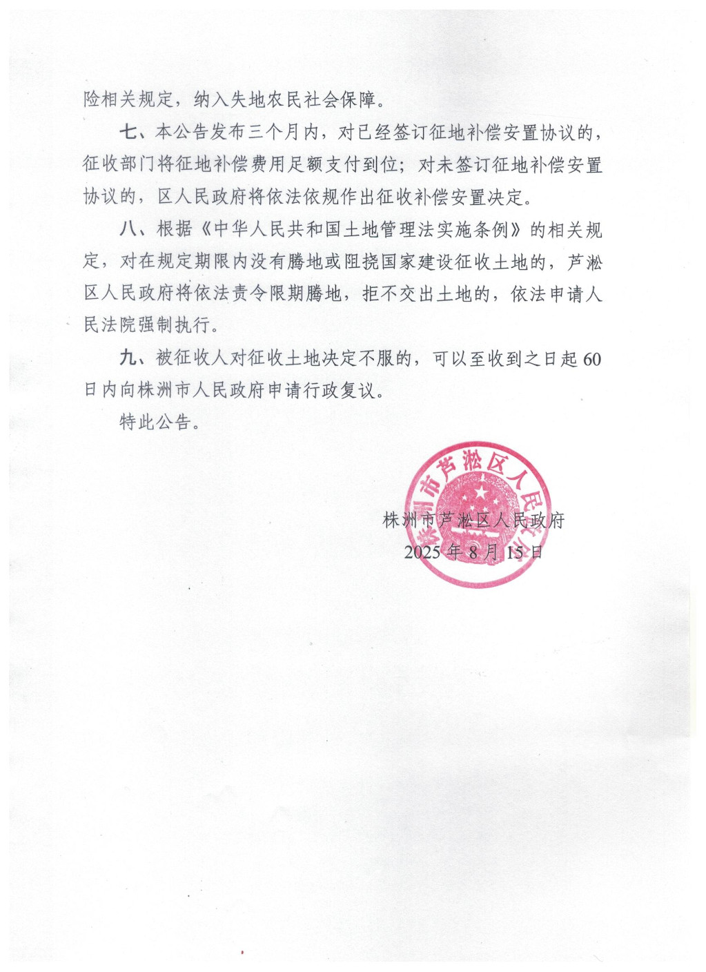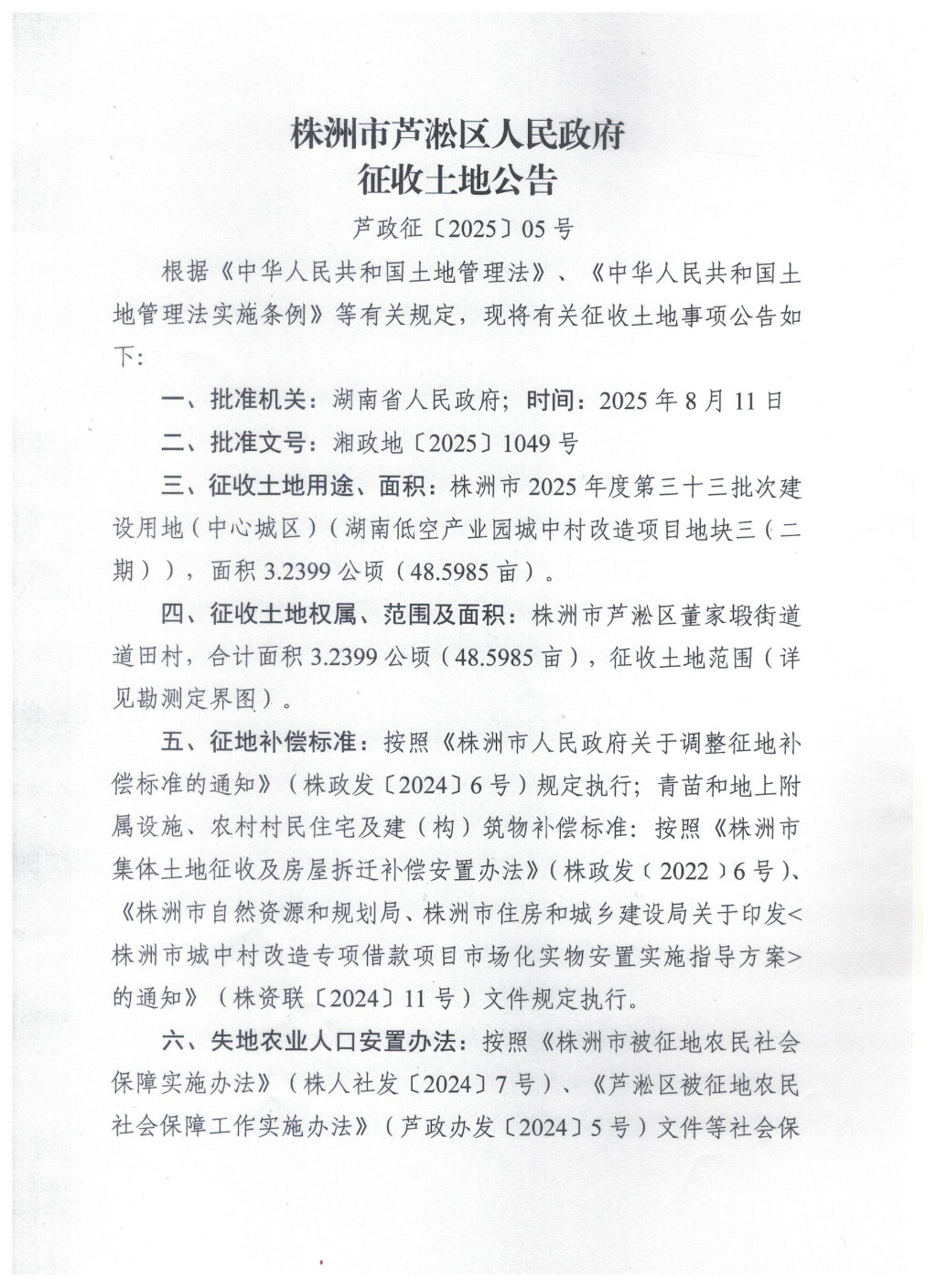 株洲市芦淞区人民政府征收土地公告(芦政征〔2025〕05号)