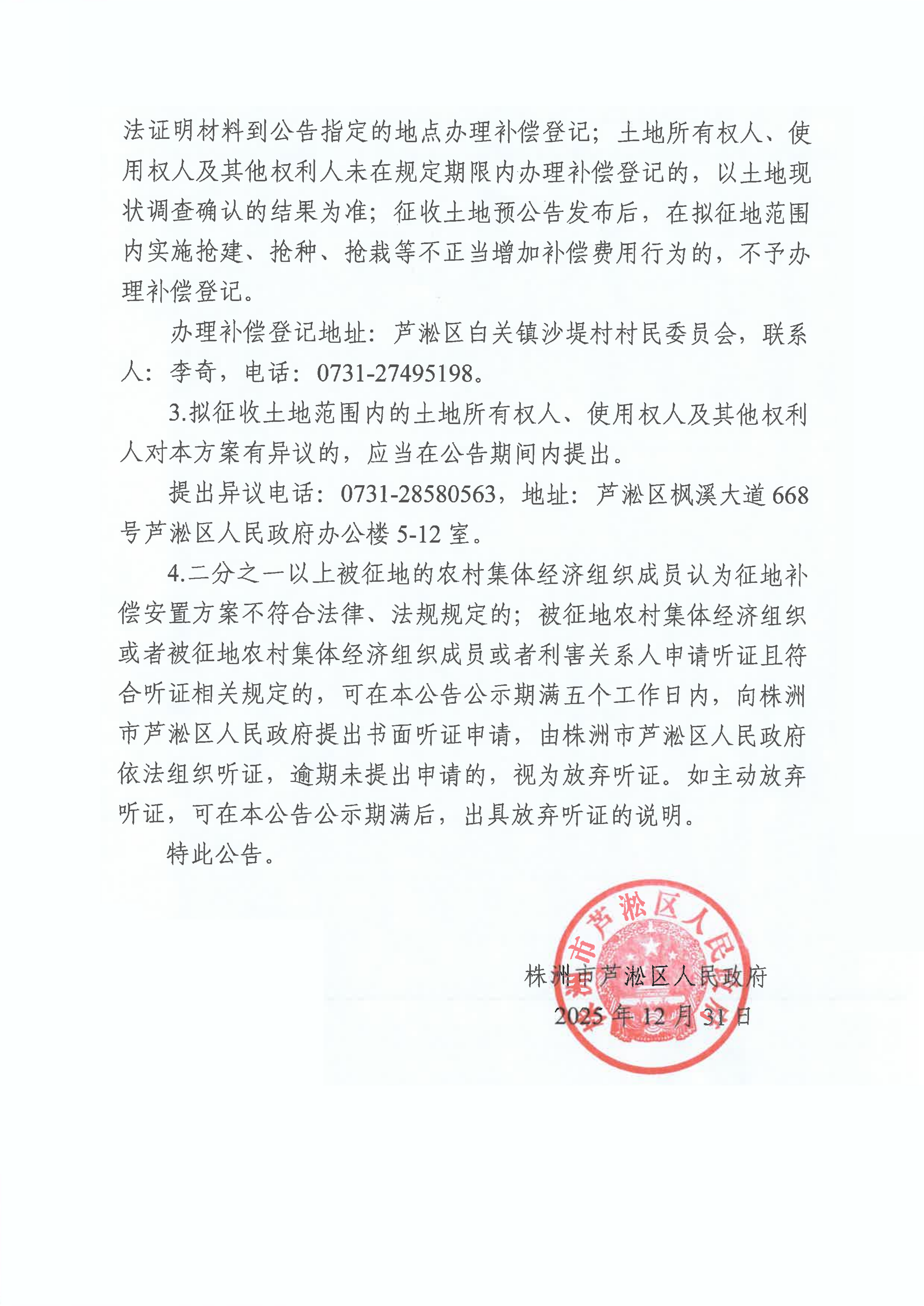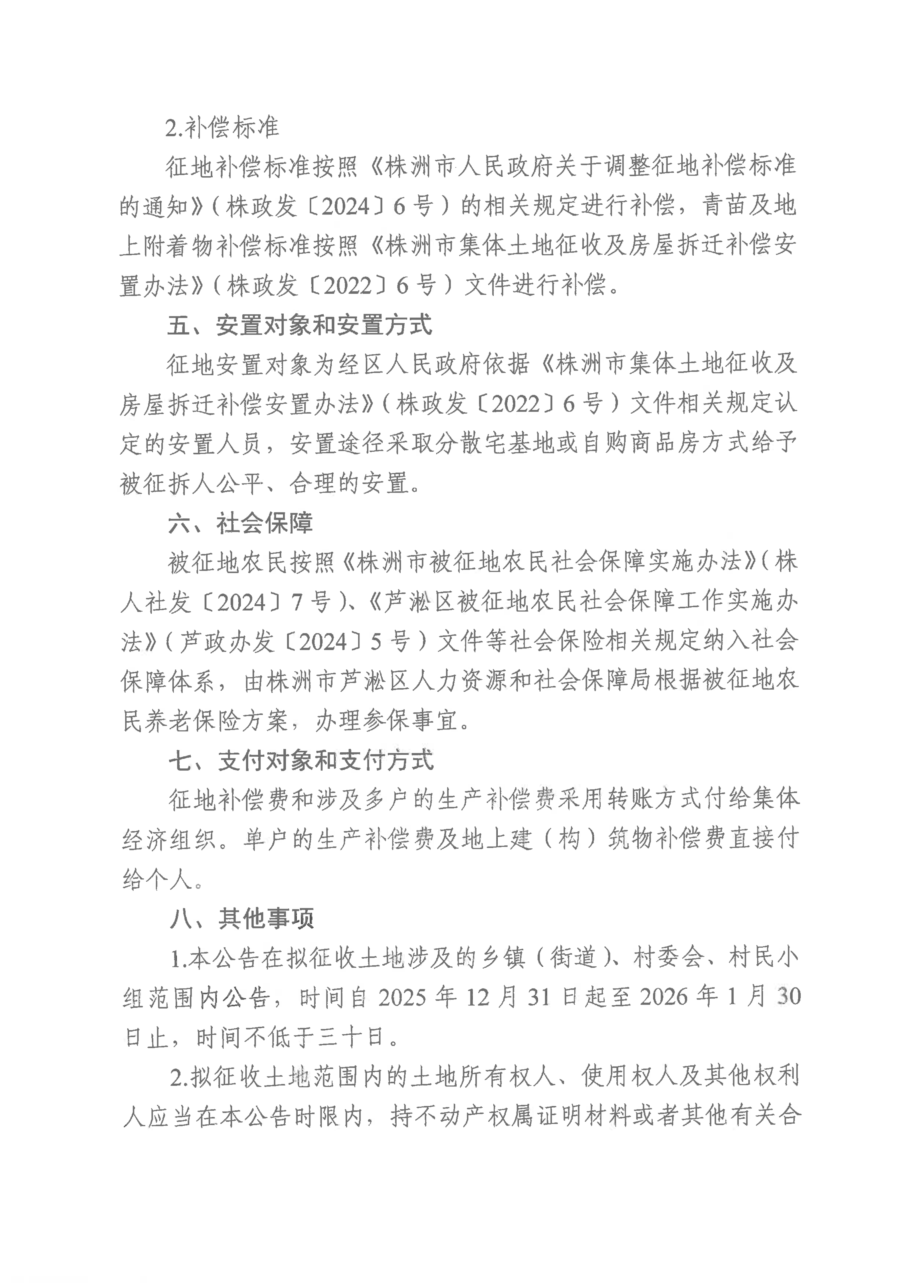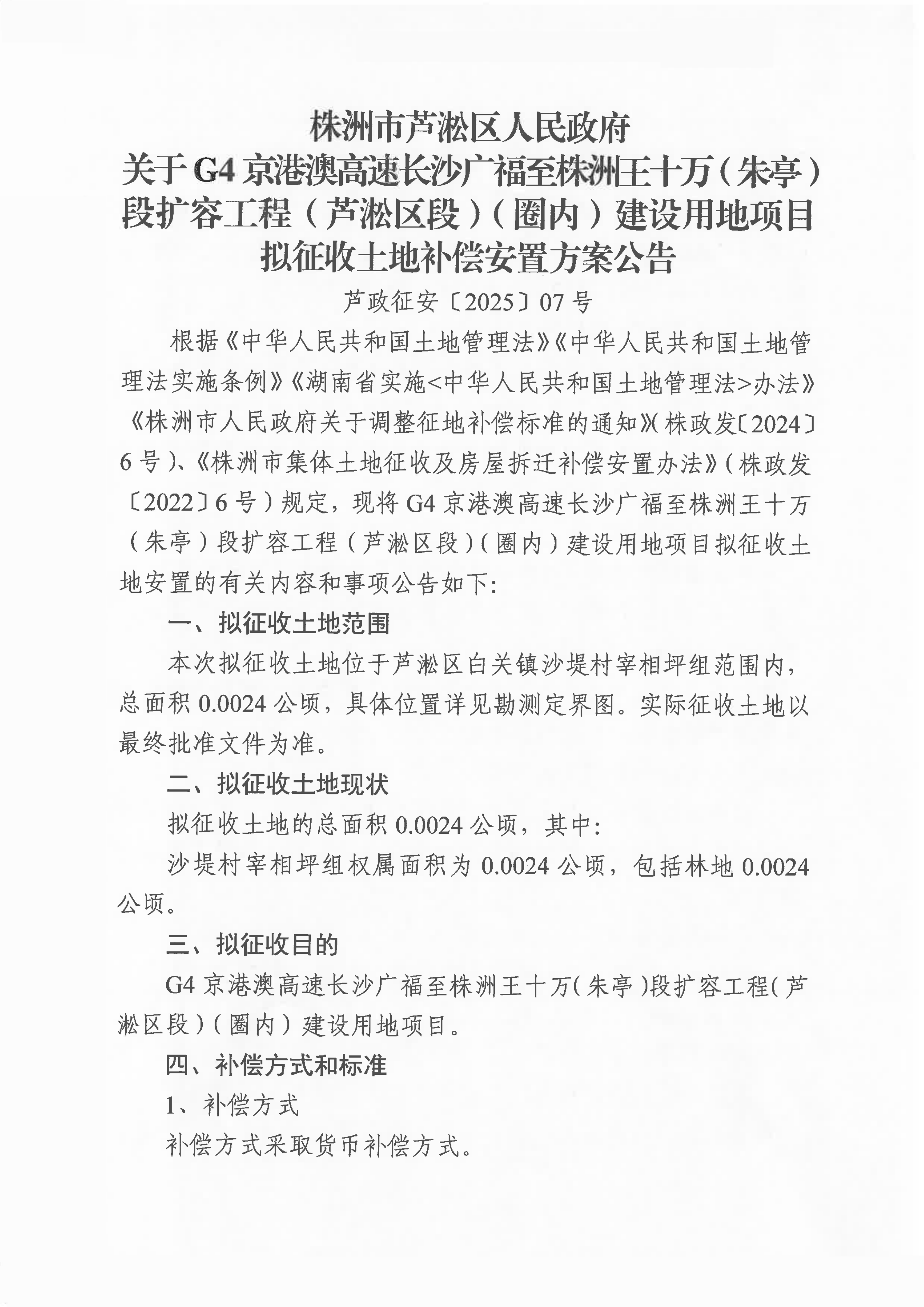株洲市芦淞区人民政府关于G4京港澳高速长沙广福至株洲王十万(朱亭)段扩容工程(芦淞区段)(圈内)建设用地项目拟征收土地补偿安置方案公告(芦政征安〔2025〕07号)