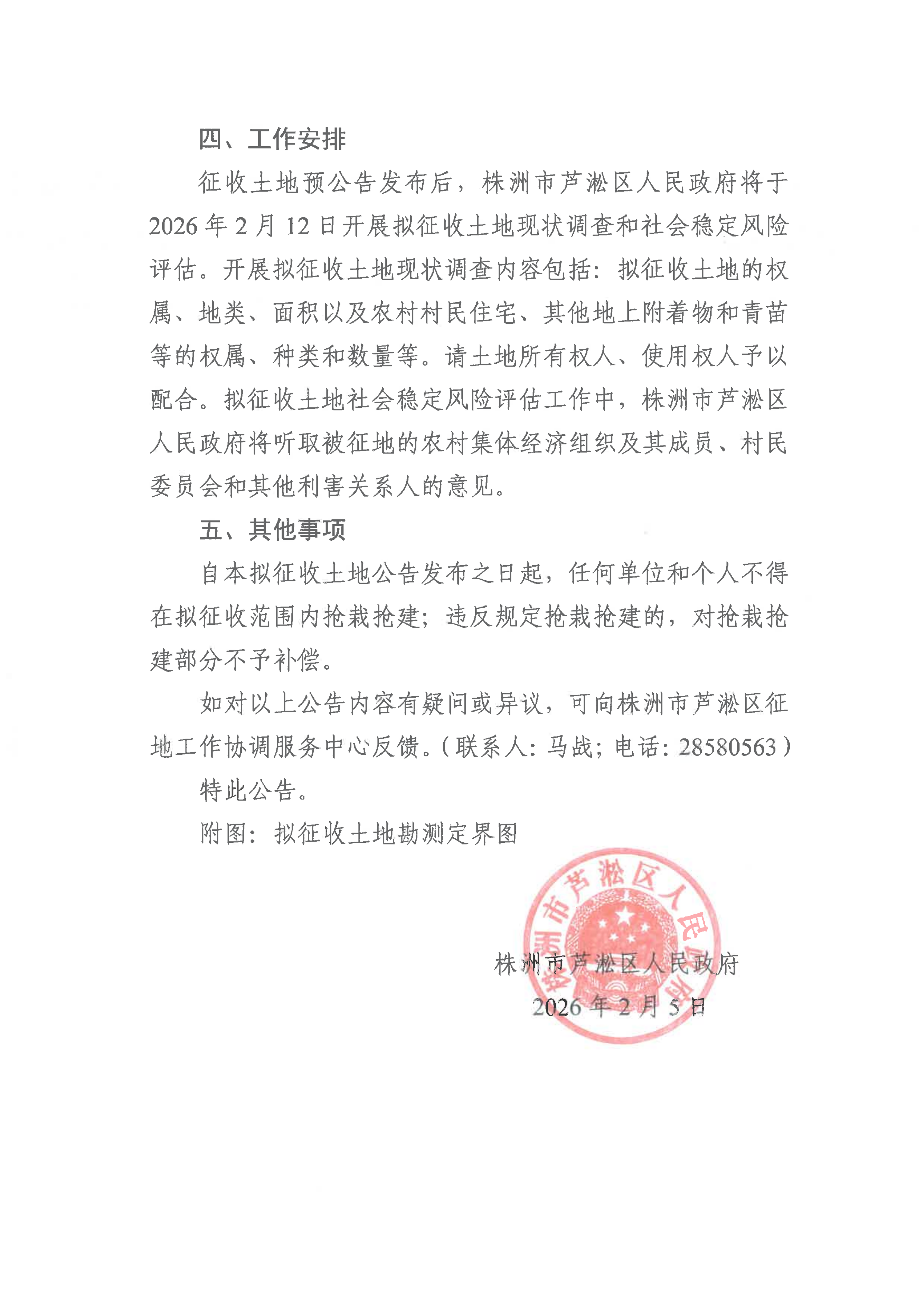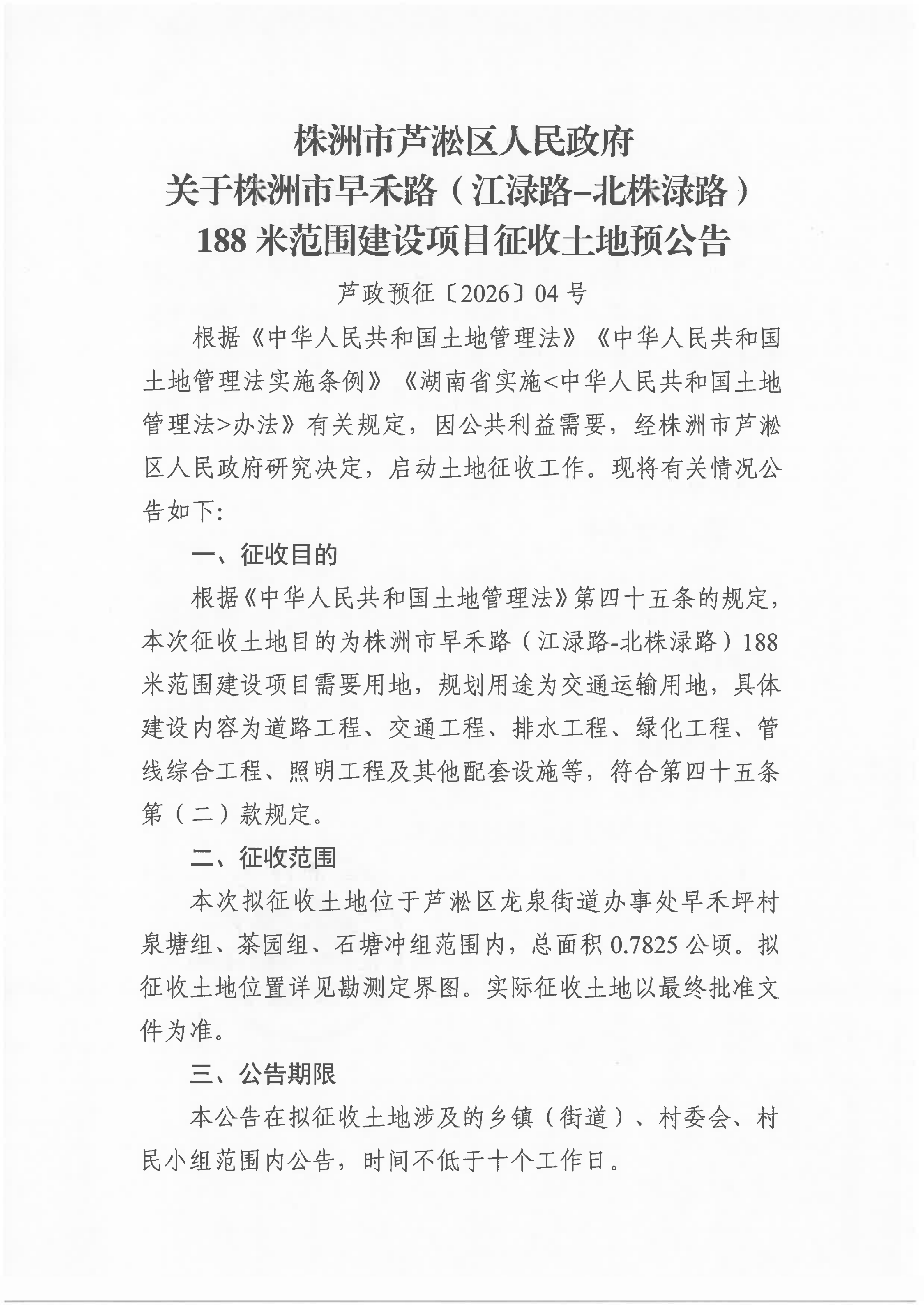 株洲市芦淞区人民政府关于株洲市早禾路(江渌路-北株渌路)188米范围建设项目征收土地预公告