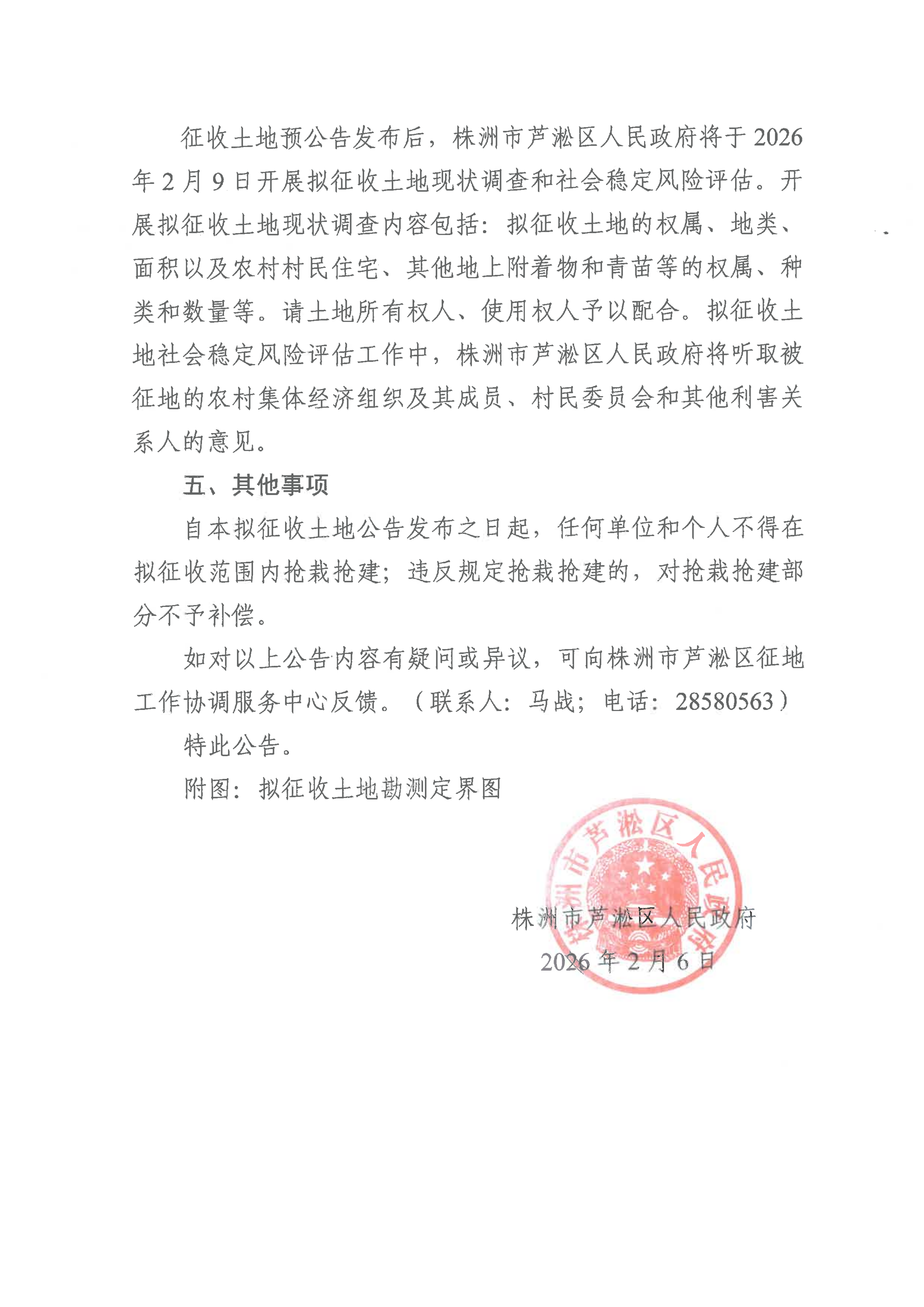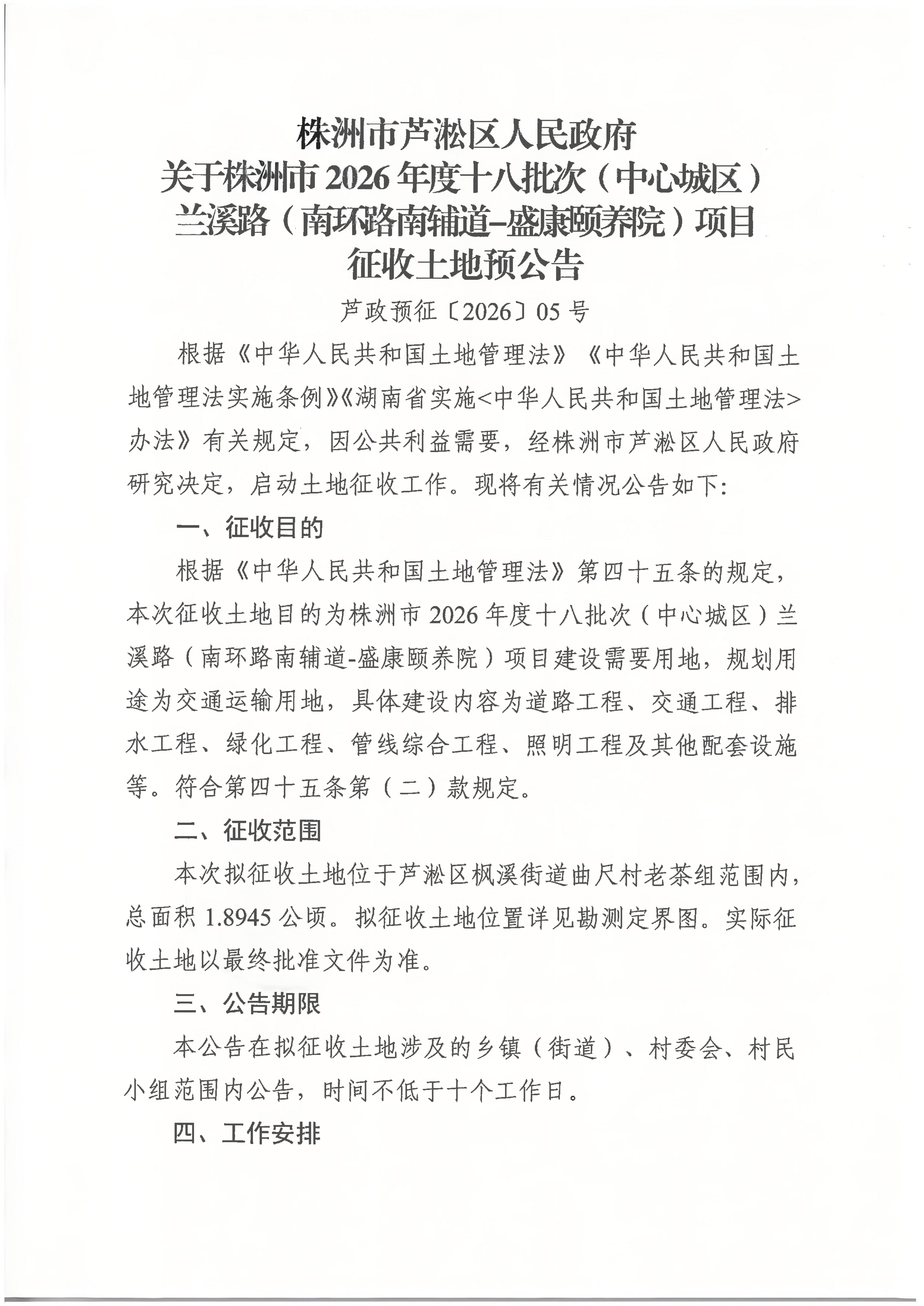 株洲市芦淞区人民政府关于株洲市2026年度十八批次(中心城区)兰溪路(南环路南辅道-盛康颐养院)项目征收土地预公告