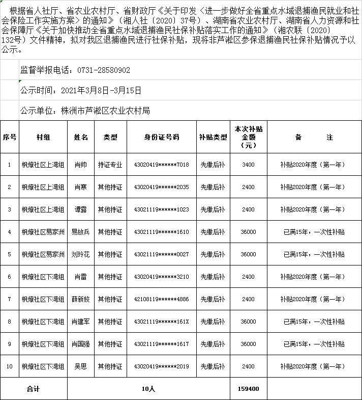 非芦淞区参保退捕渔民社保补贴发放情况公示