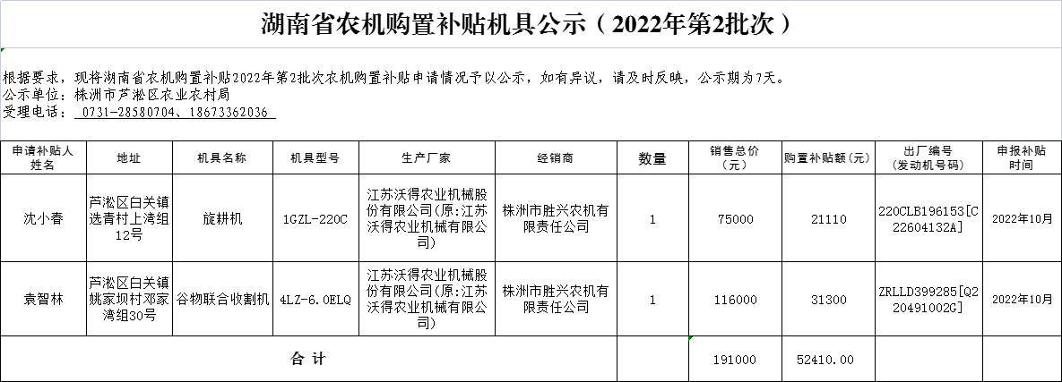 湖南省农机购置补贴机具公示(2022年第2批次)