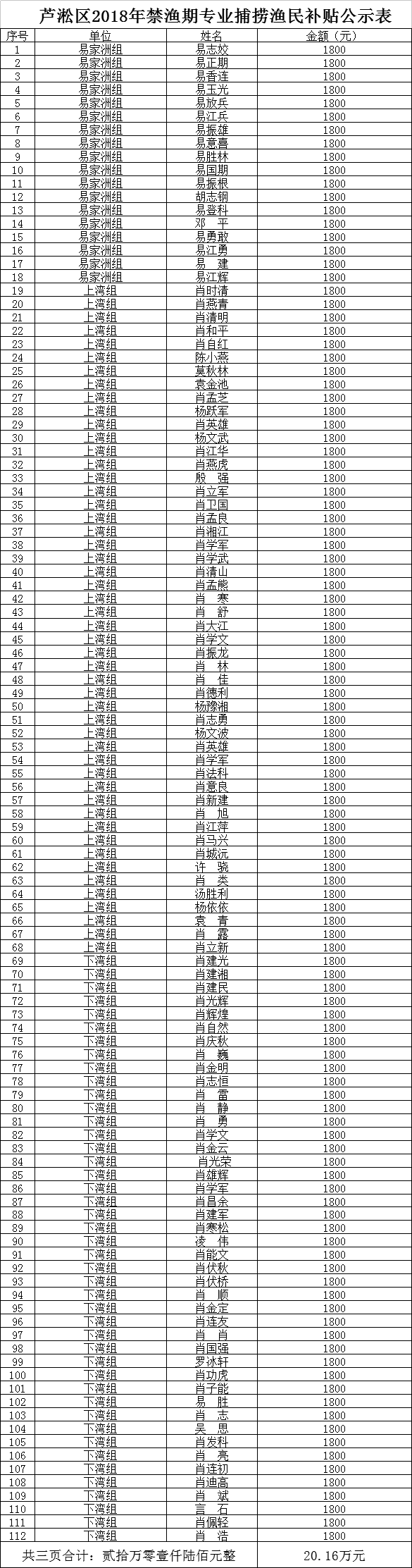 芦淞区2018年禁渔期专业捕捞渔民补贴公示表