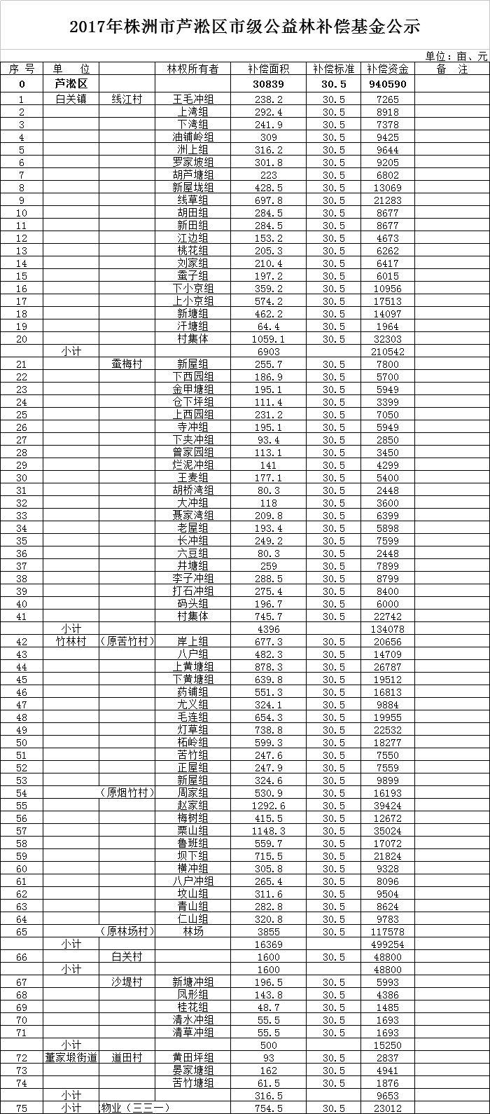 2017年株洲市芦淞区市级公益林补偿基金公示
