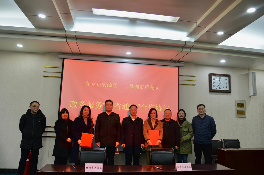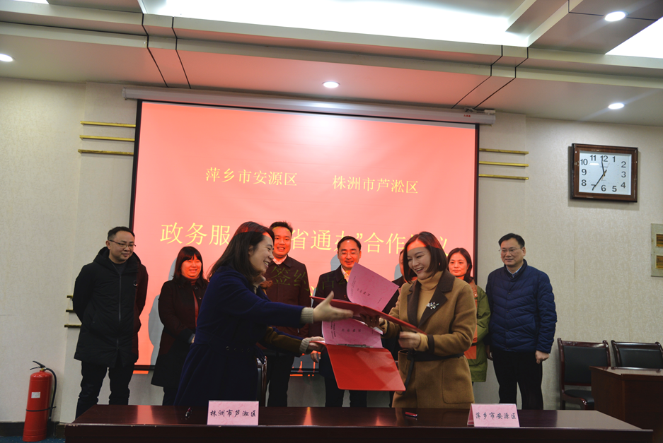 为持续优化营商环境,推动湘赣政务服务一体化和“一网通办”高质量发展,加快推进政务服务“跨省通办”,1月6日,株洲市芦淞区和萍乡市安源区政务服务“跨省通办”合作协议签约仪式在安源区举行,正式拉开两地政务服务“跨省通办”合作序幕。芦淞区政府党组成员、科技副区长赵德波一行,安源区区委常委、常务副区长刘铸,区相关单位负责同志出席仪式。