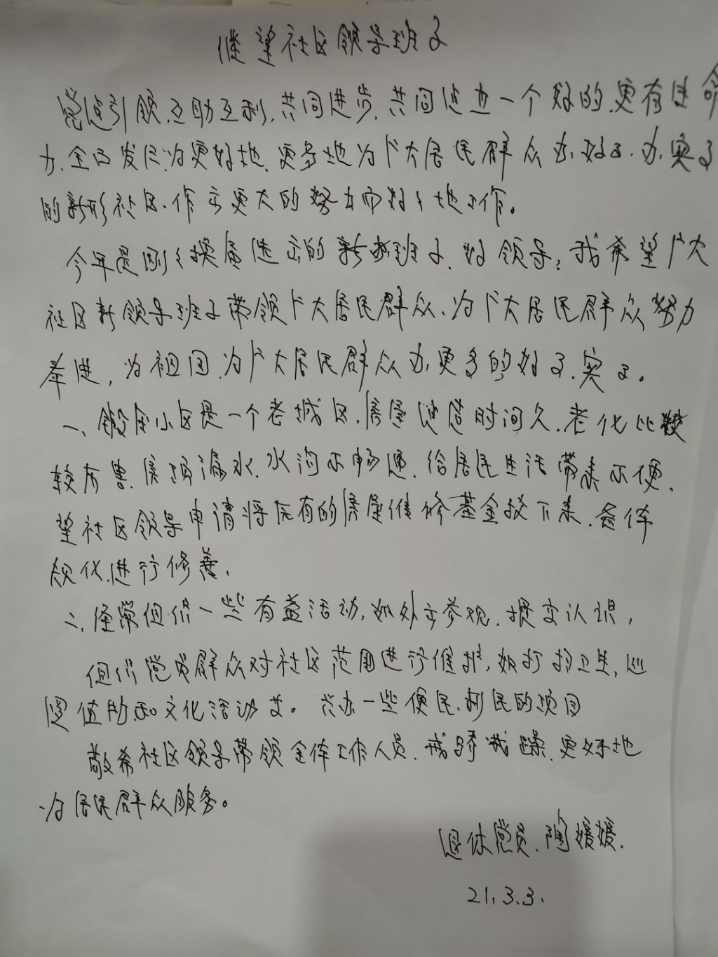 杨柳冲社区退休党员陶媛媛对社区班子提出殷切希望