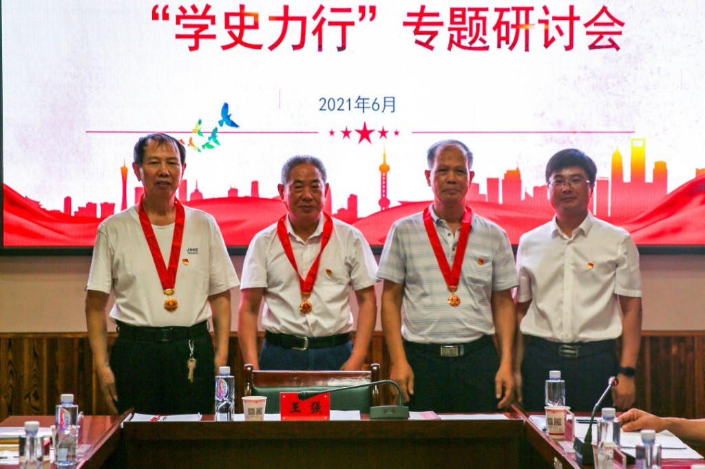 随后,王强带队前往李立三故居参观学习,听取党史讲解,缅怀老一辈无产阶级革命家崇高的革命精神,在故居陈列馆集中观看《开国大典》原声影像视频,并为3位老党员颁发“光荣在党50年”纪念章,随后开展专题学习研讨。研讨会上,政府党组班子成员集中学习了习近平总书记参观“‘不忘初心、牢记使命’中国共产党历史展览馆”时重要讲话精神及《滴水穿石的启示》理论文章,稂水云、段可文结合各自分管领域围绕“学史力行”主题作研讨发言。