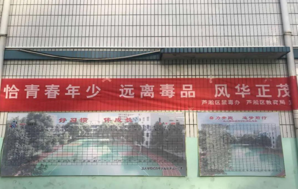 学校通过张贴禁毒宣传海报、悬挂禁毒横幅向全校师生介绍毒品的危害,号召全体师生远离毒品,珍爱生命,坚决与毒品作斗争。