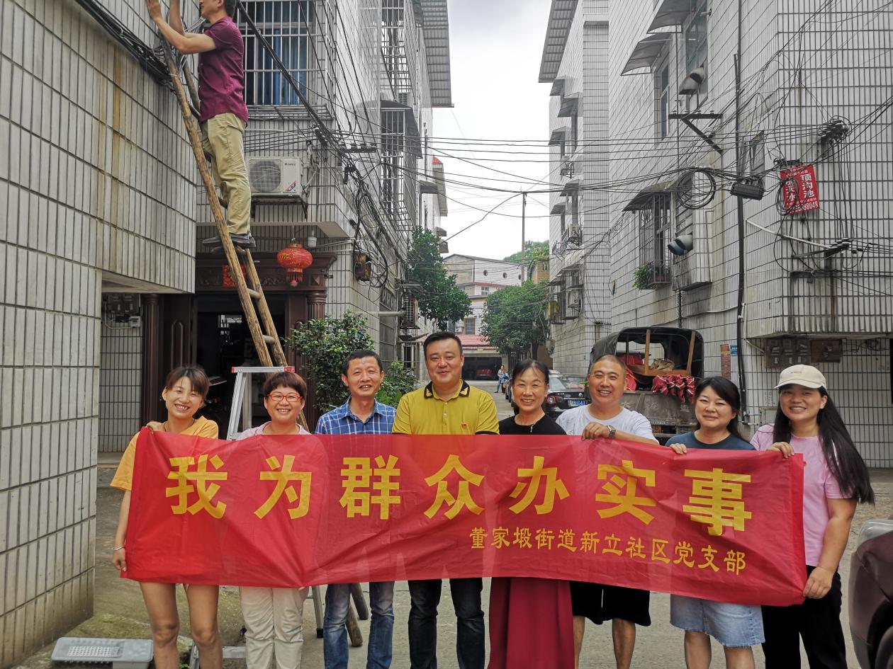 新立社区的党支部书记、网格长彭映玲(左二)率领党员为老旧小区安装路灯