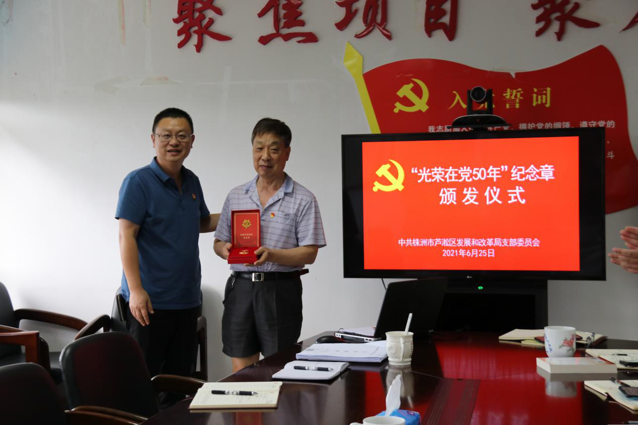 会上为老干部李庆文同志颁发了在党50年纪念章。