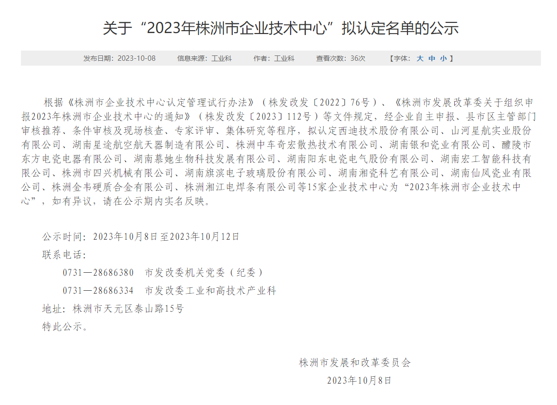 经由区发改局推荐申报,西迪技术股份有限公司、湖南星途航空航天器制造有限公司、山河星航实业股份有限公司等3家企业均获评“2023年株洲市企业技术中心”,现已在市发改委网站进行公示。