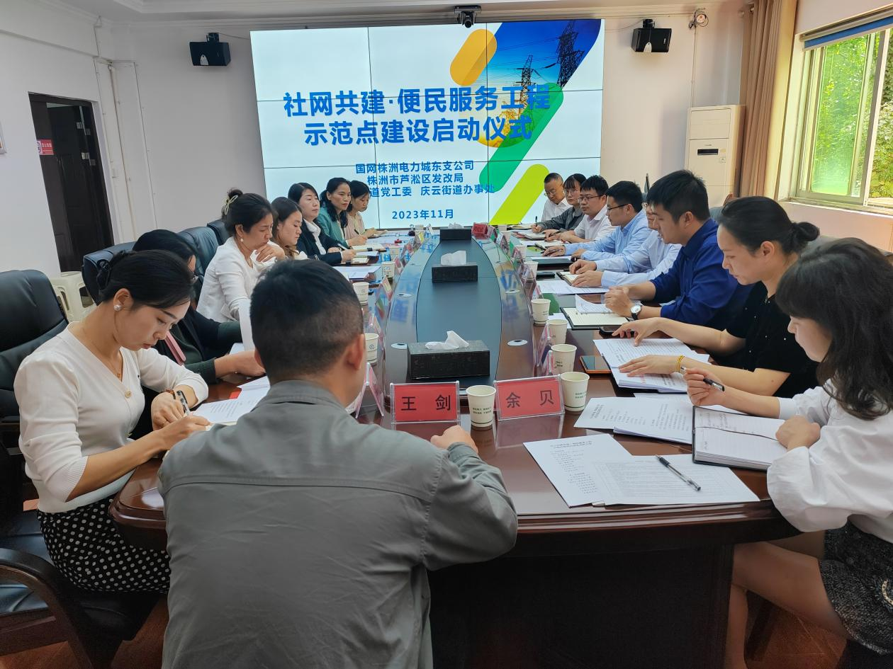 11月3日上午,在庆云街道办事处召开社网共建·便民服务工程示范点建设启动仪式,国网株洲电力城东支公司负责人、区发改局分管领导、庆云街道办事处负责人、庆云街道社区(村)书记参加。