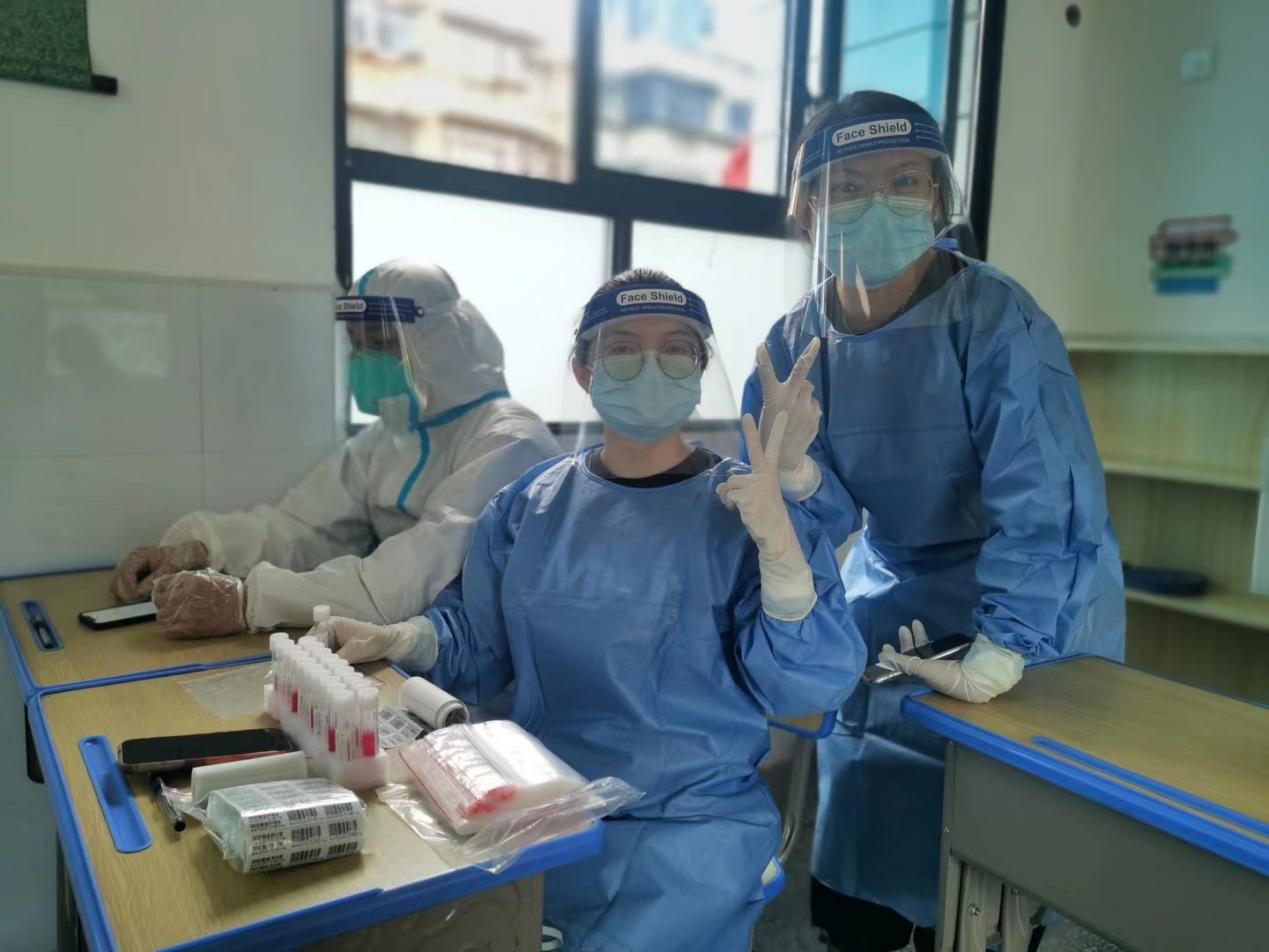 当疫情来袭,芦淞区何家坳小学的程顺老师和同是教育系统立人学校的妈妈晏淑纯老师,第一时间加入了疫情防控志愿者的队伍,原本计划利用暑假时间享受家庭的温馨,却在抗疫一线成为彼此最坚强的后盾。8月10日,程顺老师响应区教育局的号召,与何家坳小学的五名女教师一道奔赴莲塘小学核酸检测点,担任检测点的志愿者,协助完成检测工作。穿上白色蓝条防疫服,戴上口罩和护目镜后,看着镜子里的自己忽闪着一对大眼睛,程顺觉得既新奇又特别酷。小心翼翼地坐在检测医生的旁边,一张张地贴着受检者的数据条码。一切看起来并不累,可是这种新奇的感觉才过十来分钟,接下来被取代的是无法抵御的炎热。严严实实的防护服包裹着程老师,尽管旁边一台加冰的风扇开着最强档的风速,除了耳朵里能听到呼呼的风声之外,程老师竟然感觉不到一丝丝的凉意。等到四个小时的检测工作完成下来,程老师全身湿透了,衣服竟然能拧出水来。面对大家的关心,程老师打趣地说:"看来今天的防疫,是让我免费享受了一场汗蒸,应该瘦了一圈了吧。"