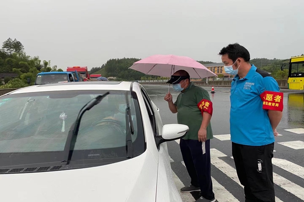 八月的株洲,天气也很调皮,时而烈日炎炎,时而瓢泼大雨,在这多变的季节里,抗疫工作仍在紧张有序的进行着,当我们都躺在家里吹空调居家隔离时,芦淞教育防疫志愿服务队一直默默无闻地坚守在疫情防控的第一线,何家坳小学的宾建明老师、周海兵老师就是志愿者中的一员。"请您摇下车窗,关掉空调,测量一下体温。""请问您从哪里来,到哪里去?""请您出示一下你的健康码"。为防止疫情通过交通运输工具传播,株洲加强了高速出入口的检查和车乘人员的体温检测。周海兵、宾建明的工作就是负责白关高速公路入口处对所有离株车辆中私乘人员的健康码和核酸检测结果的查验,8月8日全天,他们所在的志愿者队伍共计放行符合要求出城车辆120多台,符合要求出城人员200多人次;劝返车辆60多台;烈日当空,地面温度近五十度,很多志愿者都已晒伤,他们仍在烈日下坚守。下午4时狂风暴雨开始叫嚣,又正是车辆通行高峰期,志愿者们在雨中坚持,从白天到黑夜,从烈日到暴雨,一站就是一整天,衣服湿了干 ,干了湿,宾建明老师和周海斌老师一直坚守在岗位上,全身湿透情况下已经分不清哪些是汗水哪些是雨水!但为保证车辆安全和正常通行, 他们毅然选择负重前行。正是这样一群人,用爱心凝聚力量,用信心决战疫情,为疫情防控一线贡献着青春的力量!