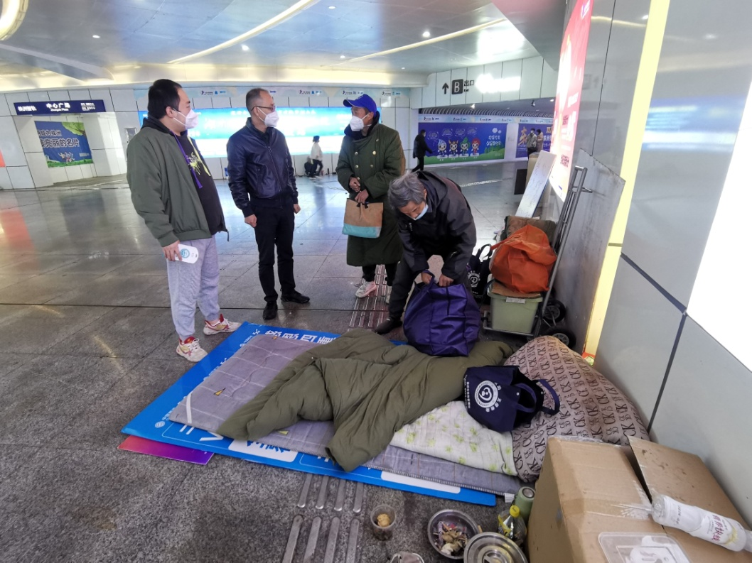 2023年1月14日,我市气温骤降,为落实关心关爱特殊困难群体要求、发挥民政部门职责、履行民生兜底保障职能,在雨雪天气来临之前,区政府任茁副区长连夜带队,区民政局局长何荣陪同,区民政局联合株洲市救助管理站、建设街道办事处、区城管局等部门在中心广场地下厅开展流浪乞讨人员救助管理行动。对滞留在我辖区内的流浪人员劝导护送其到救助管理机构接受救助,对不愿到救助管理站求助的流浪乞讨人员发放口罩、棉衣、棉被、睡袋、八宝粥、方便面等食品、保暖用品和防疫物资,切实保障逗留在我区生活无着流浪乞讨人员安全过冬。
