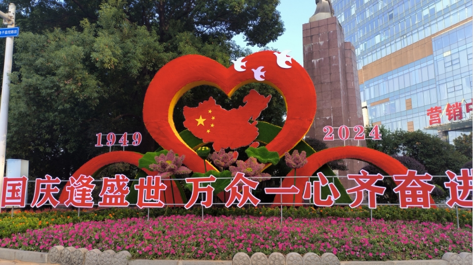 本次国庆节日氛围营造力求“新颖、大气、美观”。一是一桥桥北1个扎景和区政府门口1组扎景都是以红色为主色调,以祖国地图和国旗图案为背景,彰显出了“国庆逢盛世、万众一心齐奋进”的景象;二是花卉品种数量多,且大多数花卉在国庆节后都会全面盛开,到时将会展现出“百花争妍”“群花吐芳”的景象;三是花卉布展精巧,园林师傅们对木本花卉和草本花卉、大盆花卉与小盆花卉、观花花卉与观叶观果花卉进行了巧妙搭配,做到了轮廓分明、亮点突出、色彩协调,给人一种美轮美奂的感觉。