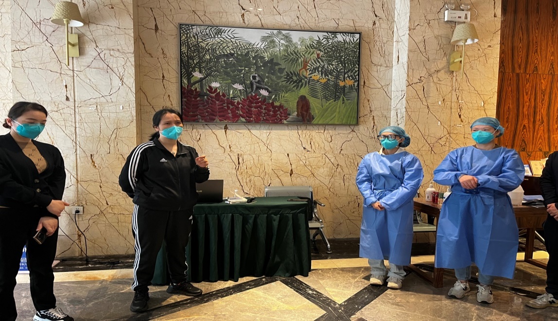 在这里,医务人员每天早上6点开始在清洁区做准备工作,按照防疫要求穿戴好防护装备,互相检查有无差错。准备就绪后,8点准时进入污染区开始工作,安全起见,必须两两一组,队员们不能单独行动。核酸采样、测体温、环境消毒、清理医疗废弃物......一套流程下来差不多需要3个小时。为了避免感染,酒店的中央空调不能开启,在一个密闭的环境里,加上密不透风的防护服、面屏、n95口罩,还没等到工作结束,大家已是一身汗水,没有一片干的地方。