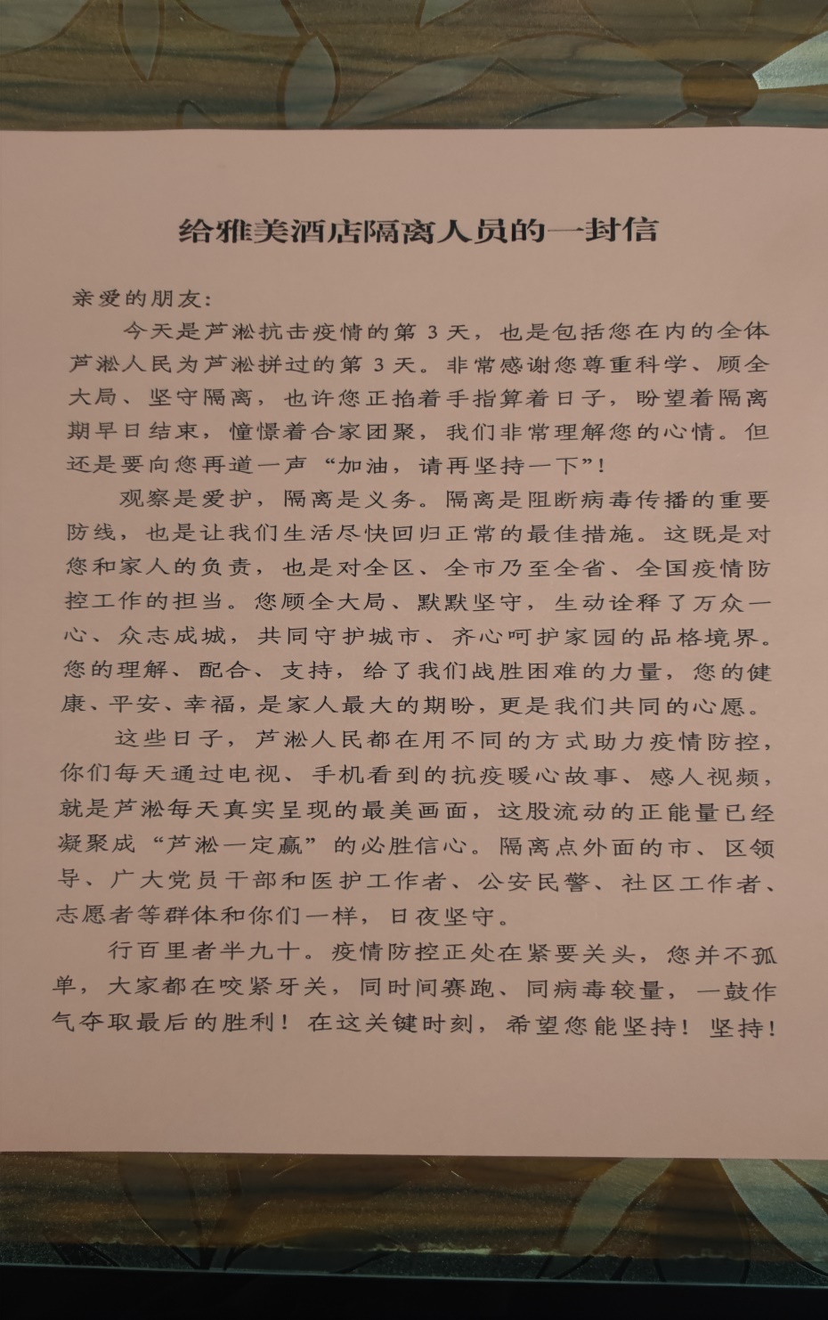 区人社局作为雅美隔离酒店责任单位,一方面,派干部驻点24小时值守,随时关注隔离人员状态,随时准备处理突发情况,畅通沟通渠道,将前台作为需求热线,工作人员从这里获取隔离人员各类需求,细致梳理,尽最大努力满足。积极引导隔离人员,做好大家的心理安抚工作,帮助大家以良好的心态度过隔离期。另一方面,细致做好综合协调与后勤保障工作,帮助他们配备生活必需品,精心制作致隔离人员的一封信,鼓励大家积极乐观,互帮互助,联系心理医生为隔离人员提供心理疏导与咨询,让隔离人员生活有保障,隔离有温度,确保隔离点安全高效有序地运转。