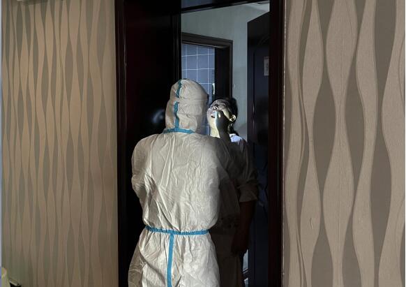 118酒店隔离点的两栋楼80个房间,由刘锴和他的4名同事守护。从起床、穿好防护服、取餐到早餐派送到位,刘锴和同事必须在一个小时之内完成。8点开始,刘锴要做好上午的核酸检测采样准备工作。9点到10点,刘锴和同事要以平均每分钟一个的速度完成采样,同时询问隔离人员健康状况并为他们检测体温。