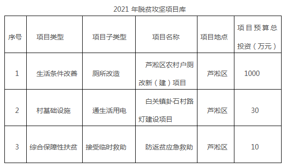 按照《国务院扶贫办印发<关于完善县级脱贫攻坚项目库建设的指导意见>的通知》(国开办发〔2018〕10号)、《国务院扶贫办关于进一步做好县级脱贫攻坚项目库建设的通知》精神和省、市有关工作要求,经领导小组办公室同意,现将全区共3个项目纳入我区2021年度脱贫攻坚项目库。(详见附件)