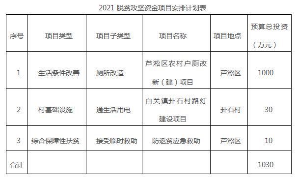 按照《国务院扶贫办印发<关于完善县级脱贫攻坚项目库建设的指导意见>的通知》(国开办发〔2018〕10号)、《国务院扶贫办关于进一步做好县级脱贫攻坚项目库建设的通知》精神和省、市有关工作要求,拟将全区共3个项目纳入我区2021年度脱贫攻坚资金项目计划,其中村基础设施类1个、生活条件改善类1个,综合保障性扶贫类1个,涉及项目预算总投资1030万元(详见附件),现予以公示。