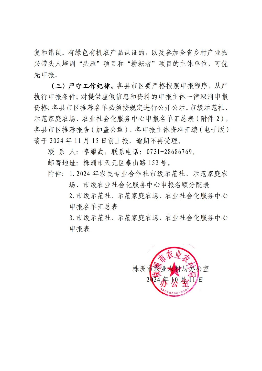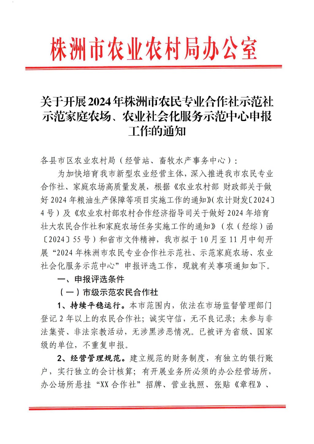关于开展 2024 年株洲市农民专业合作社示范社示范家庭农场、农业社会化服务示范中心申报工作的通知