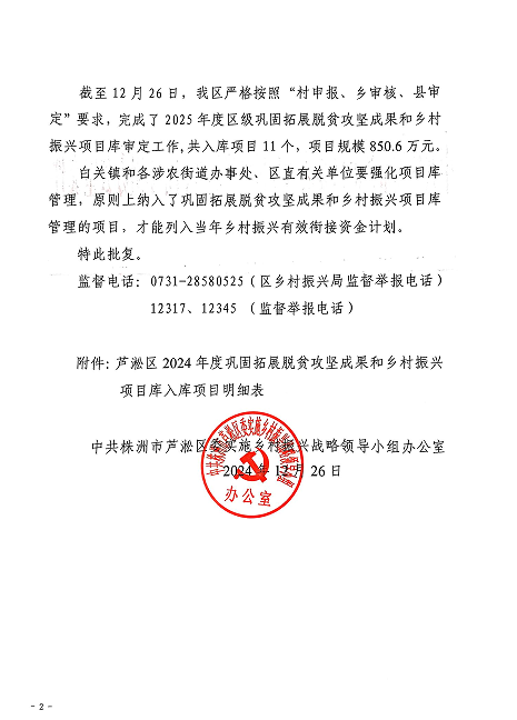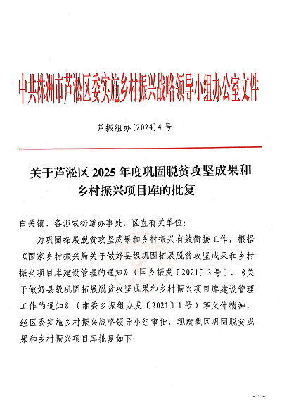 关于芦淞区2025年度巩固脱贫攻坚成果和乡村振兴项目库的批复