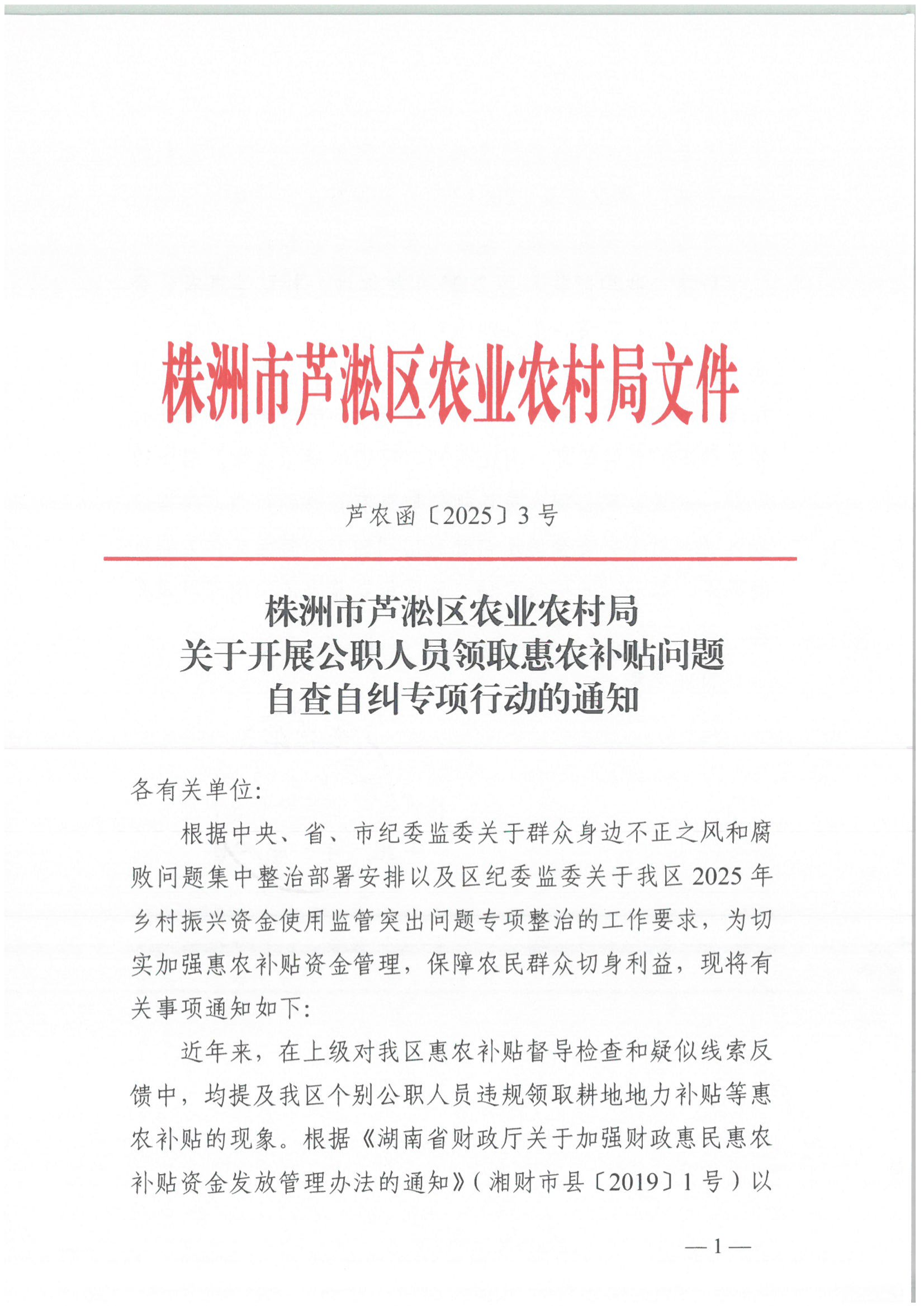株洲市芦淞区农业农村局关于开展公职人员领取惠农补贴问题自查自纠专项行动的通知