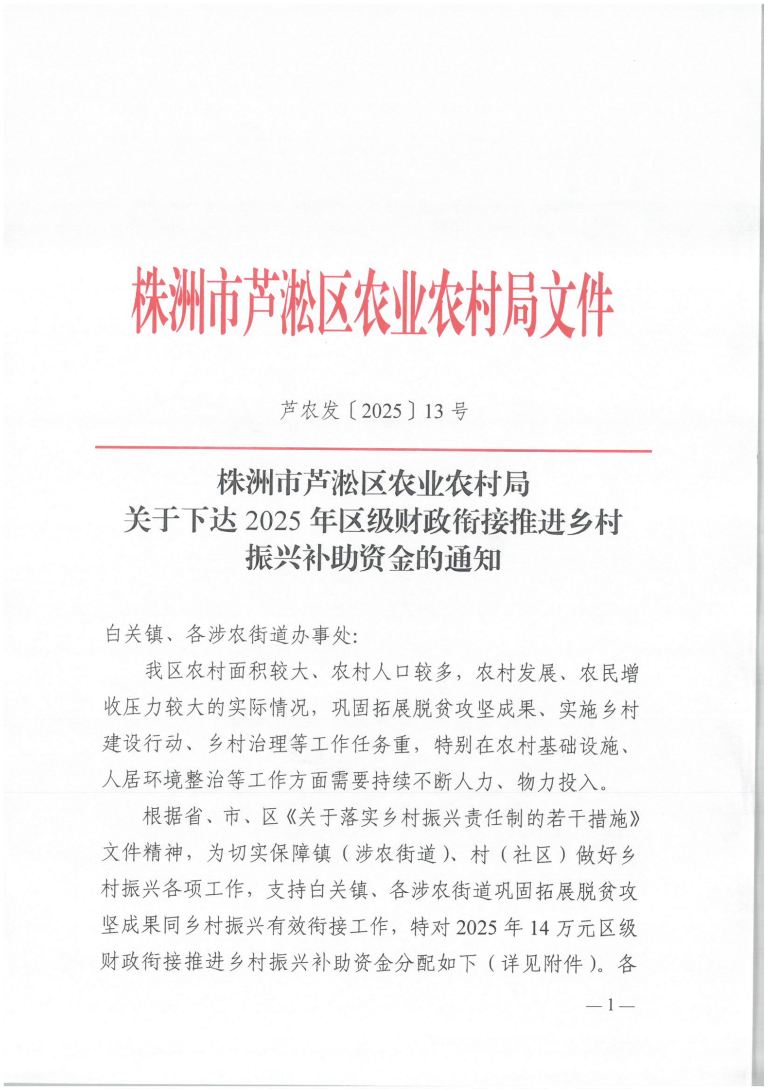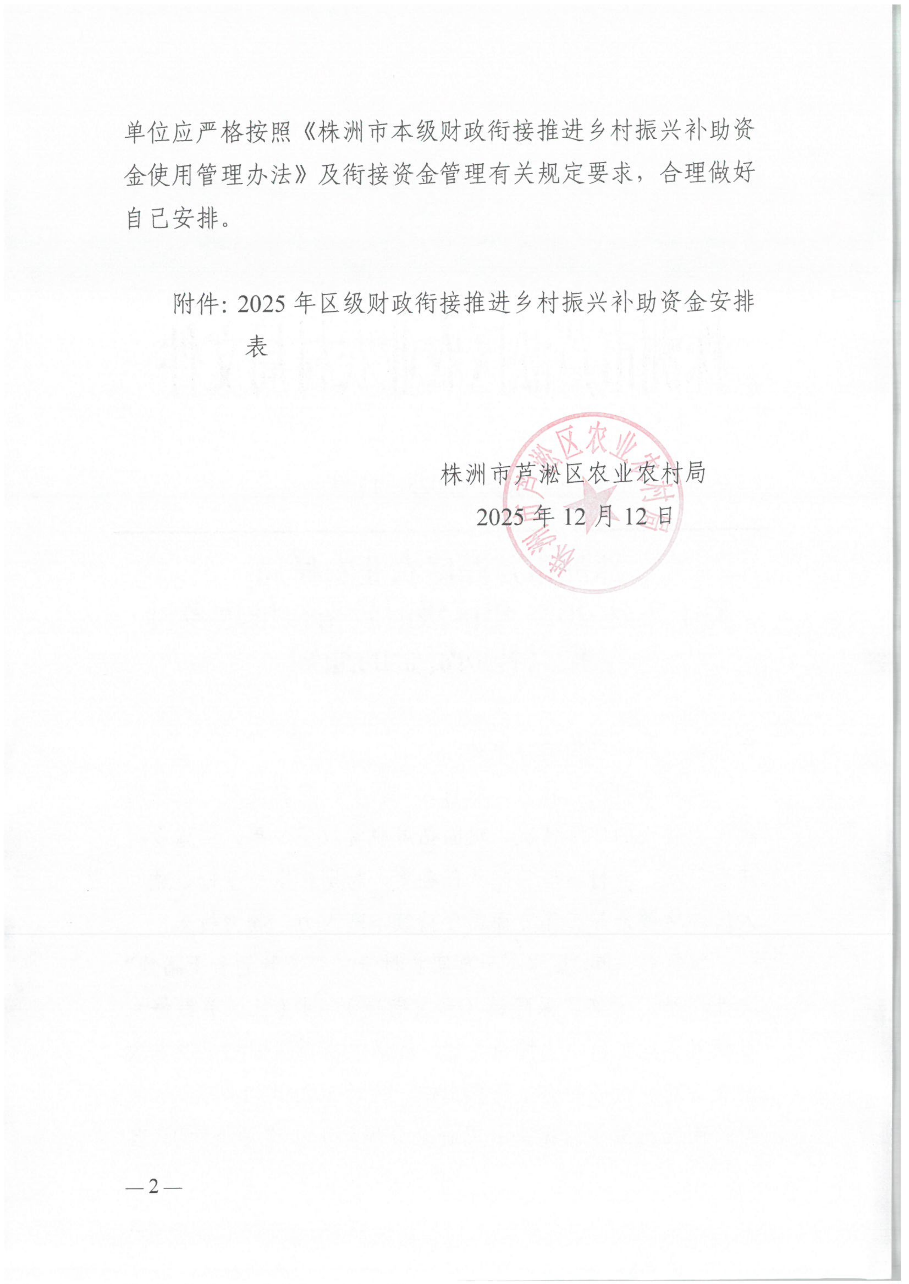 关于下达2025年区级财政衔接推进乡村振兴补助资金的通知