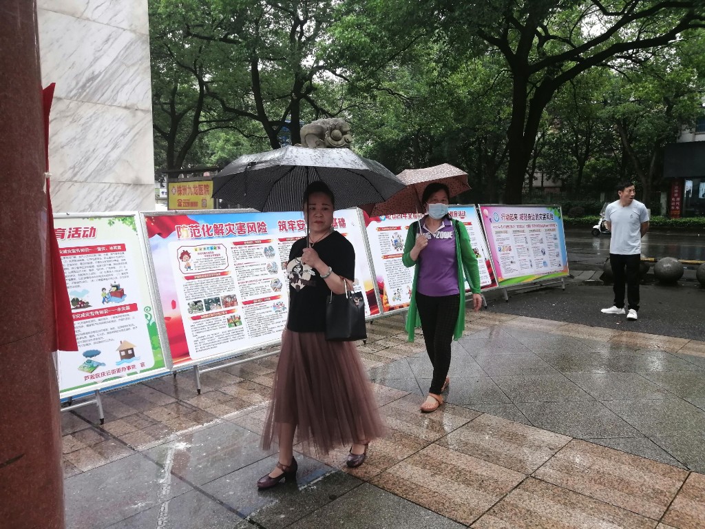 虽然下着小雨,但丰富的宣传板画还是吸引一些居民驻足观看,社区安全监督员正在为居民普及防灾减灾安全知识。