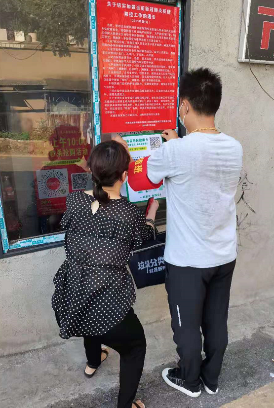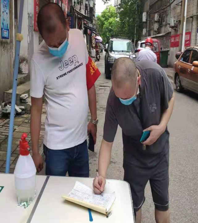 志愿者们除了宣传疫情防控指挥部的文件精神、查看每家店面工作人员健康码之外,还要求沿街店面进行全面消毒,对进店客户及时做好登记、测量体温、查看行程码,并耐心劝导不戴口罩的人员。