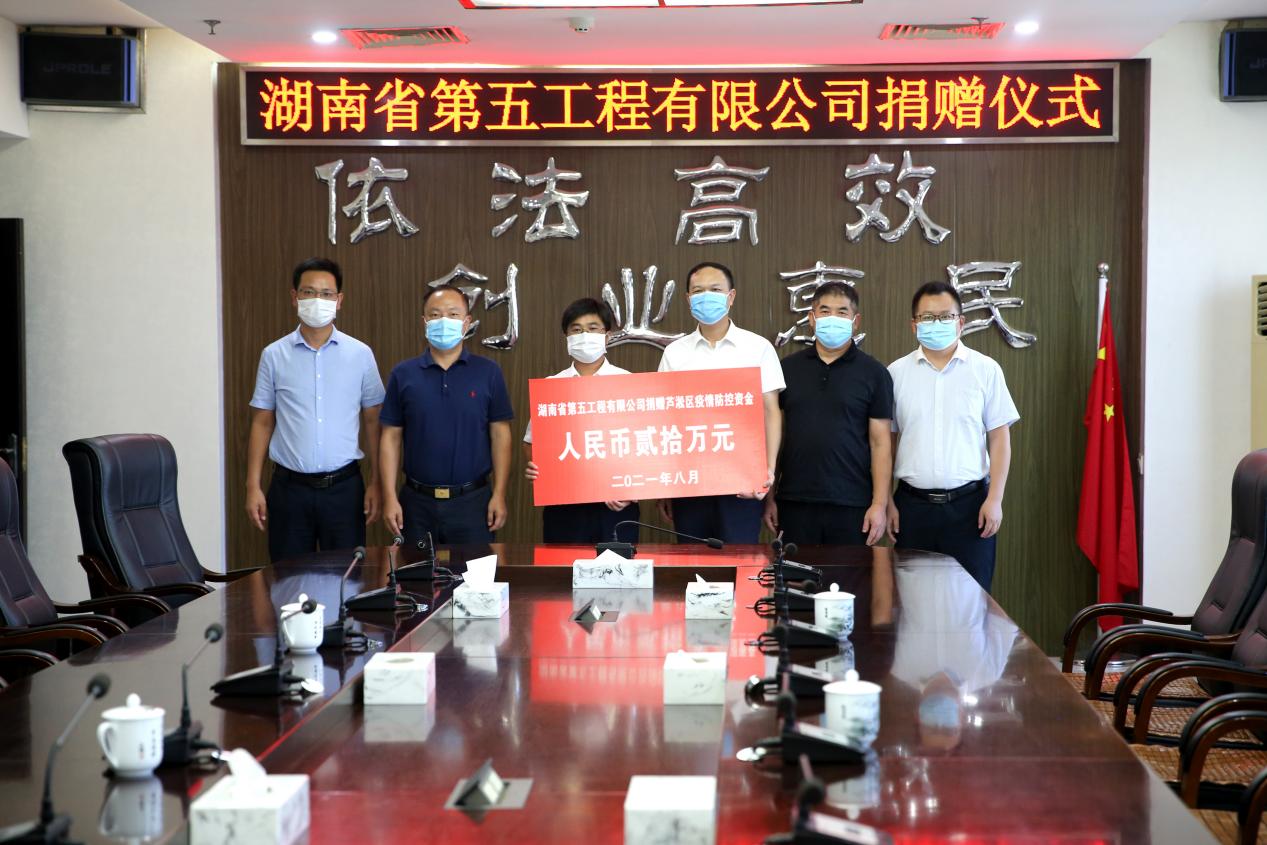 我街道代表龙兴,湖南省第五工程有限公司董事长,为助力株洲市疫情防控工作,用实际行动履行国企责任,8月6日,湖南省第五工程有限公司,积极向芦淞区捐赠防疫资金20万元,用于疫情防控。